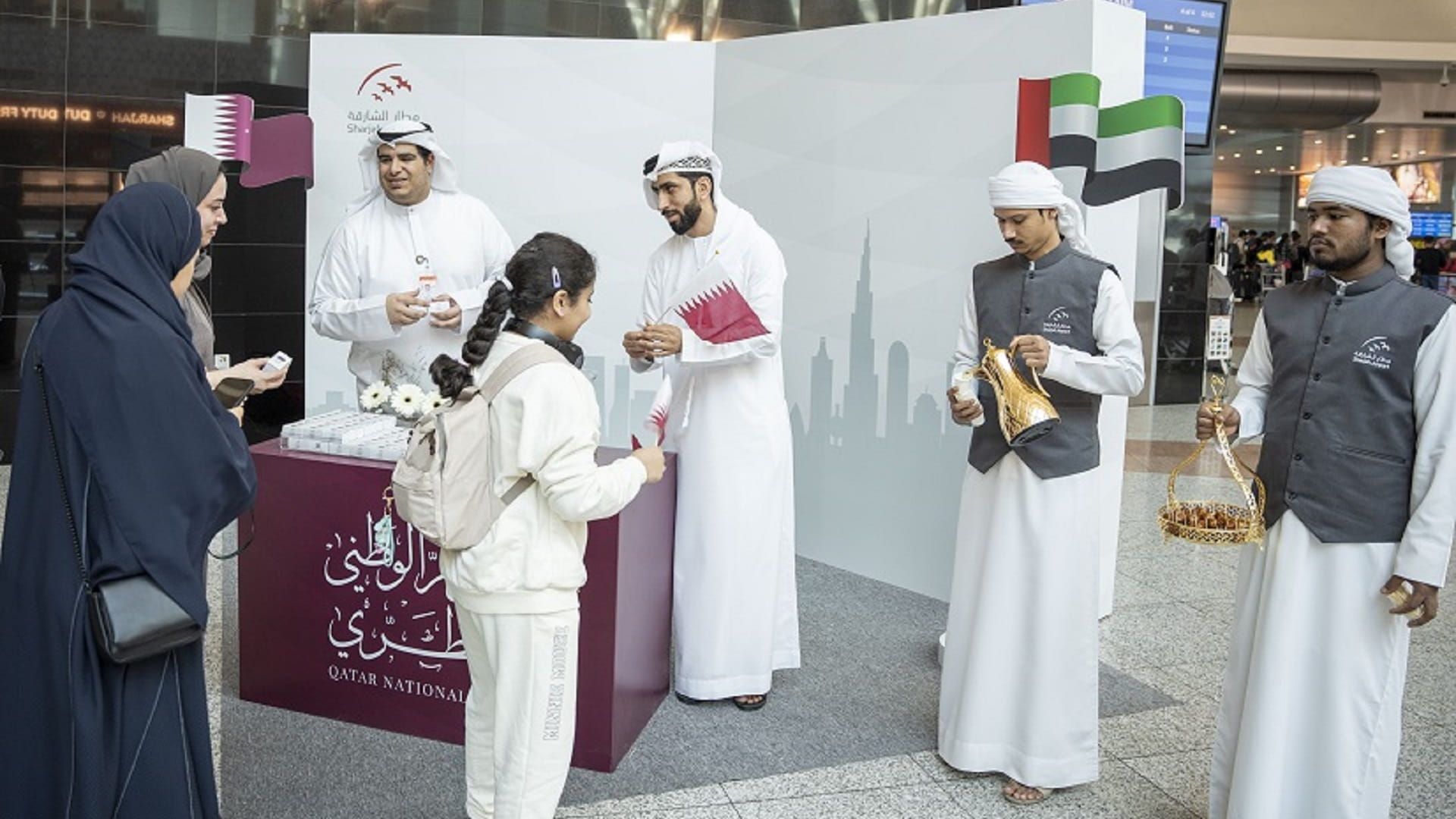 استقبل مطار الشارقة الدولي، المسافرين القطريين، بمظاهر احتفالية، ووزّع عليهم الورود والهدايا، بمناسبة اليوم الوطني لبلادهم، وتجسيداً لعمق العلاقات الأخوية بين البلدين والشعبين الشقيقين.