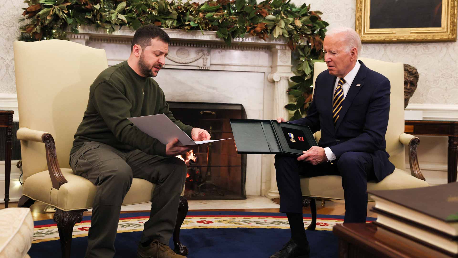 كعربون امتنان ورمز لصداقة دائمة، قلّد الرئيس الأوكراني فولوديمير زيلينسكي الرئيس الأميركي جو بايدن ميدالية عسكرية من ضابط أوكراني، حيث استقبل جو بايدن نظيره الأوكراني، في البيت الأبيض يوم الأربعاء، وأكد بايدن مجدداً على مواصلة الدعم الأميركي لأوكرانيا مع استمرار الحرب.