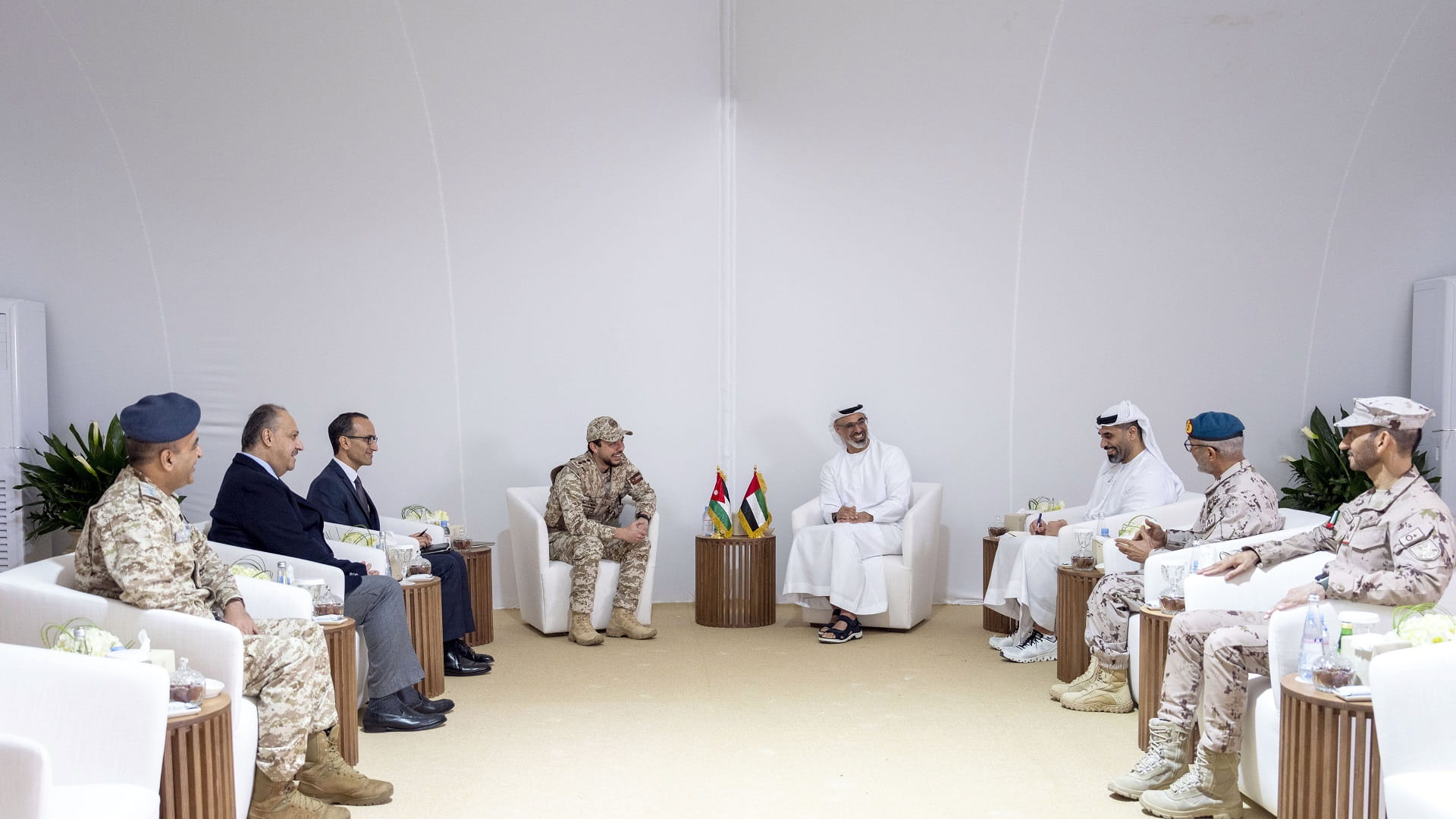 وبحث سموهما - خلال اللقاء الذي جرى على هامش التمرين العسكري التعبوي المشترك بين البلدين في أبوظبي - العلاقات الأخوية التاريخية الراسخة، التي تجمع البلدين بقيادة صاحب السمو الشيخ محمد بن زايد آل نهيان رئيس الدولة "حفظه الله"، وأخيه الملك عبد الله الثاني بن الحسين عاهل الأردن.