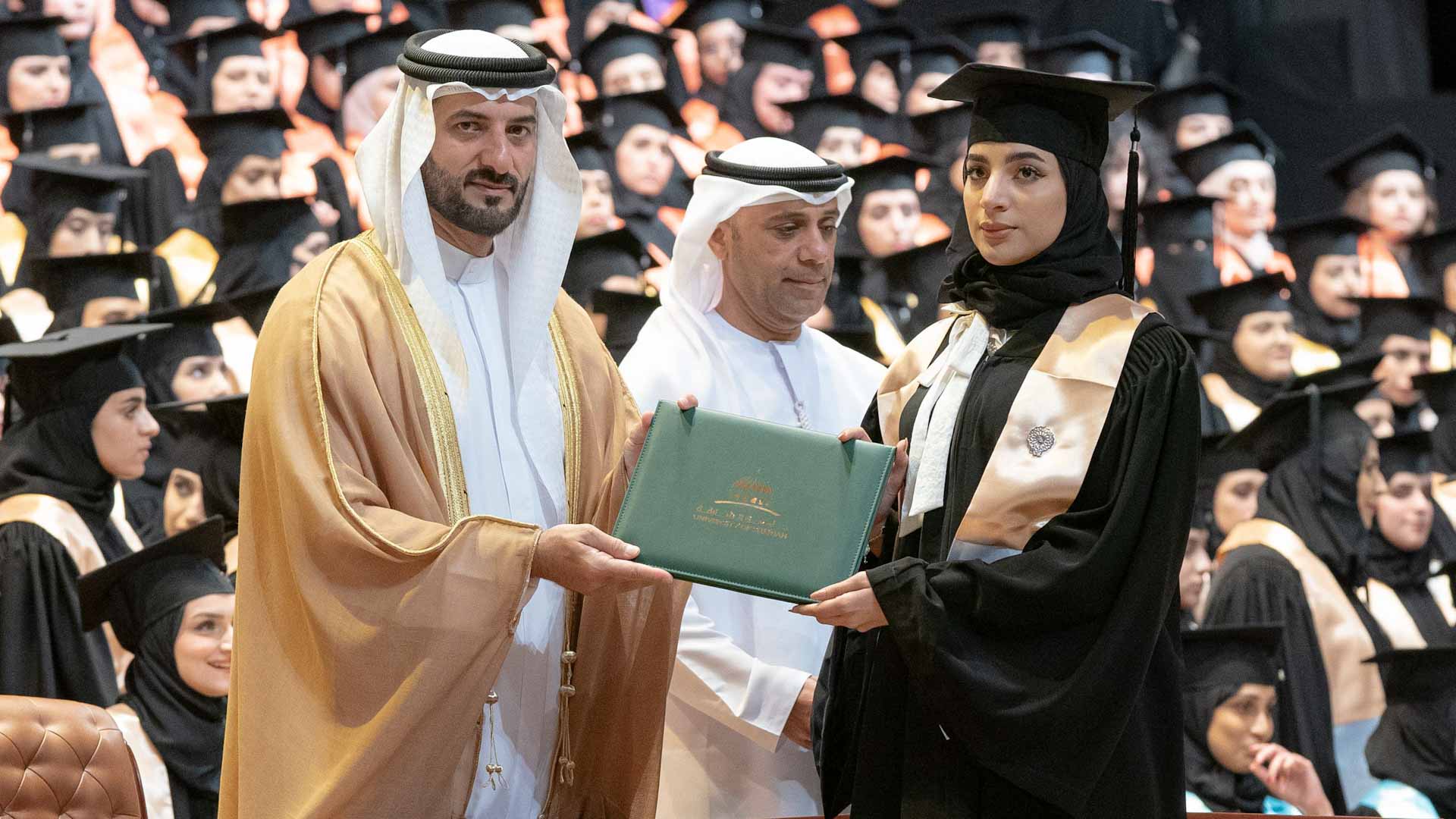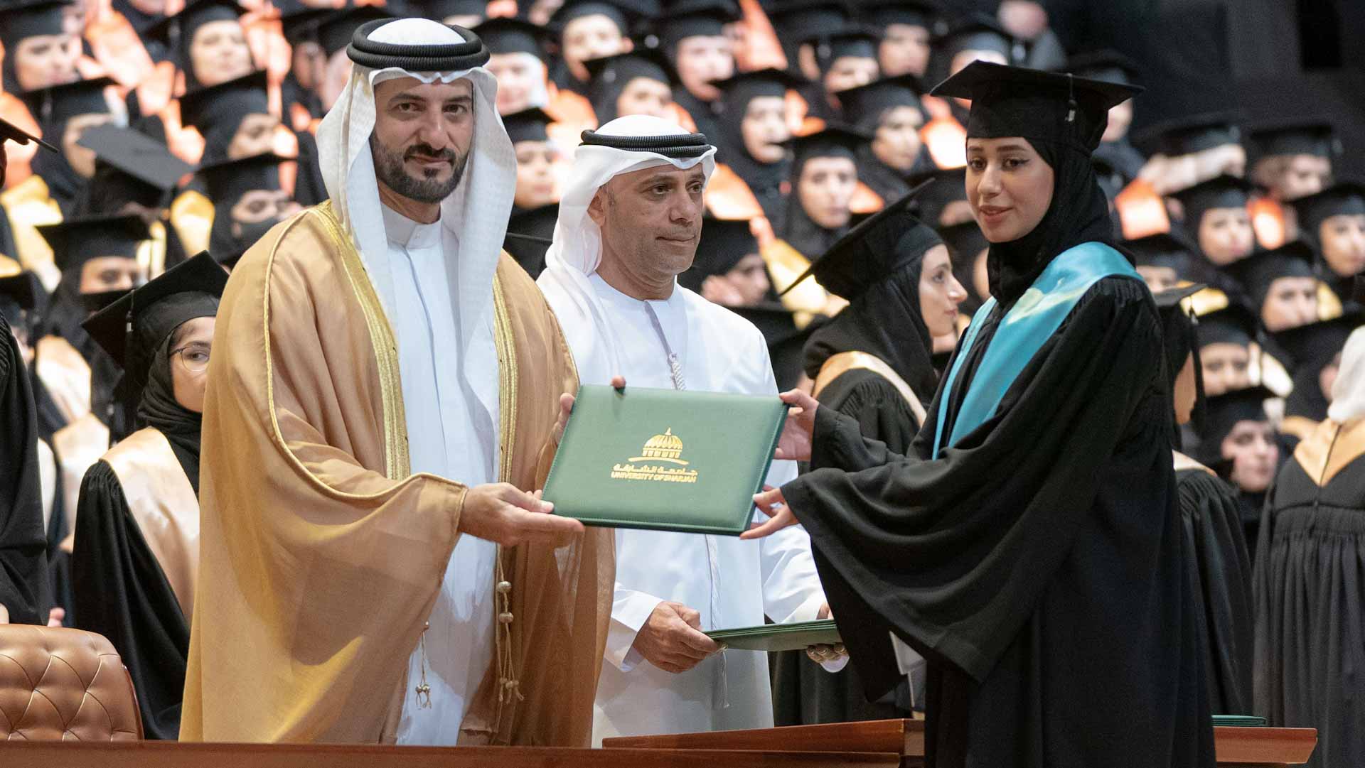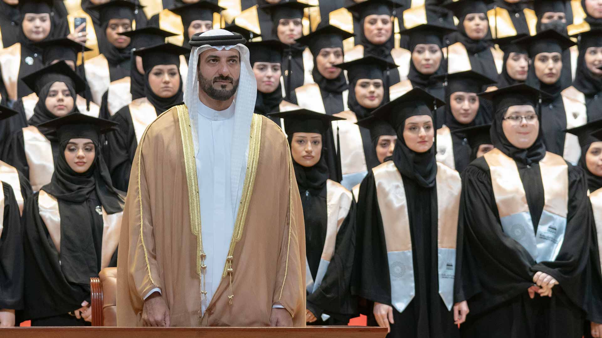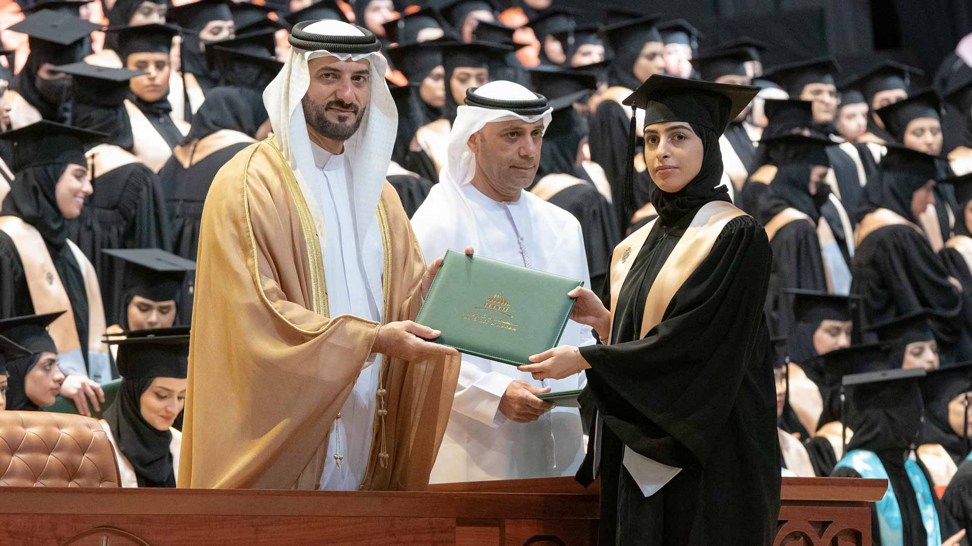 وفي لفتة إنسانية، كرم سموه أسرة الطالبة المغفور لها سارة سعيد الزعابي، التي أكملت دراستها بالجامعة، وانتقلت إلى رحمة الله قبل حضور التخريج. وتسلم والدها شهادة التخرج.