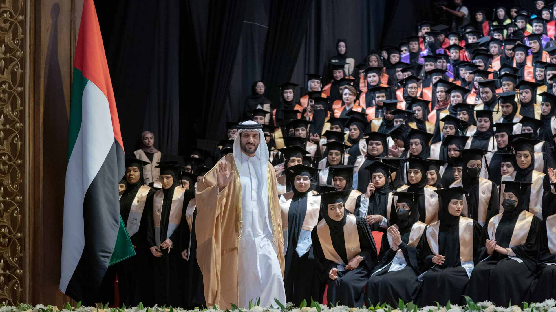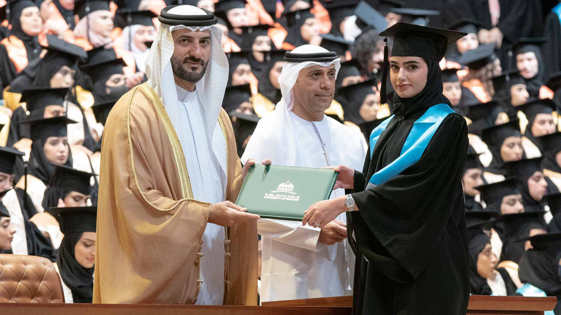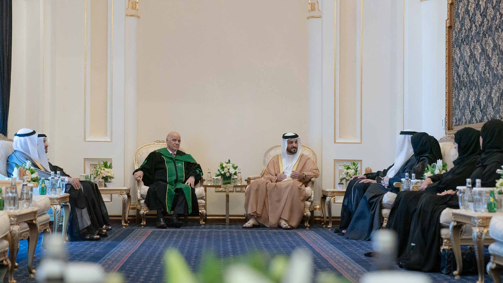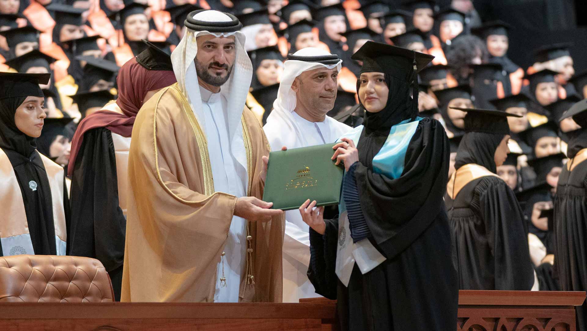 وفي لفتة إنسانية، كرم سموه أسرة الطالبة المغفور لها سارة سعيد الزعابي، التي أكملت دراستها بالجامعة، وانتقلت إلى رحمة الله قبل حضور التخريج. وتسلم والدها شهادة التخرج.