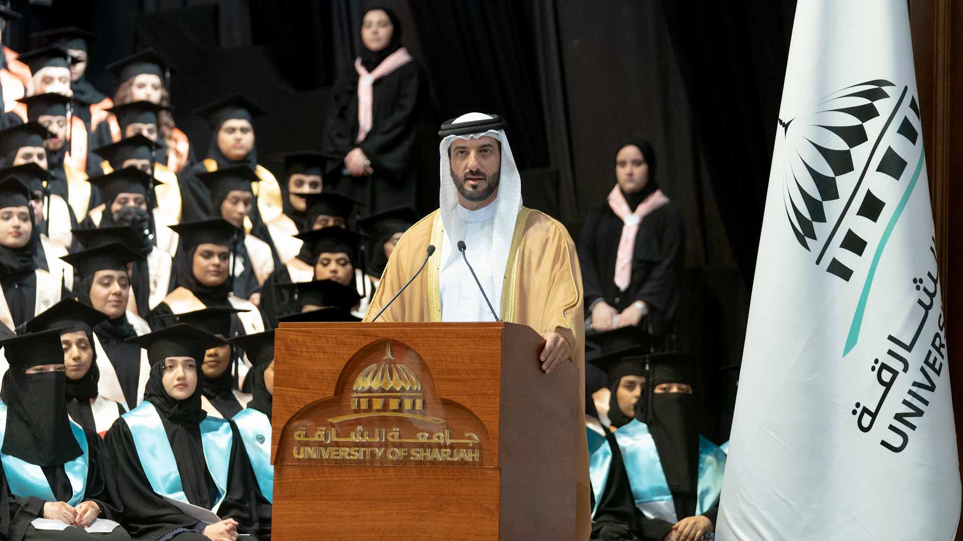شهد سمو الشيخ سلطان بن أحمد بن سلطان القاسمي، نائب حاكم الشارقة، رئيس جامعة الشارقة، صباح اليوم السبت، حفل تخريج طالبات "دفعة اليوبيل الفضي" لدرجة البكالوريوس بجامعة الشارقة، لفصلي صيف 2021-2022 وفصل الخريف 2022-2023م من كليات الجامعة المختلفة، وذلك في قاعة المدينة الجامعية.
