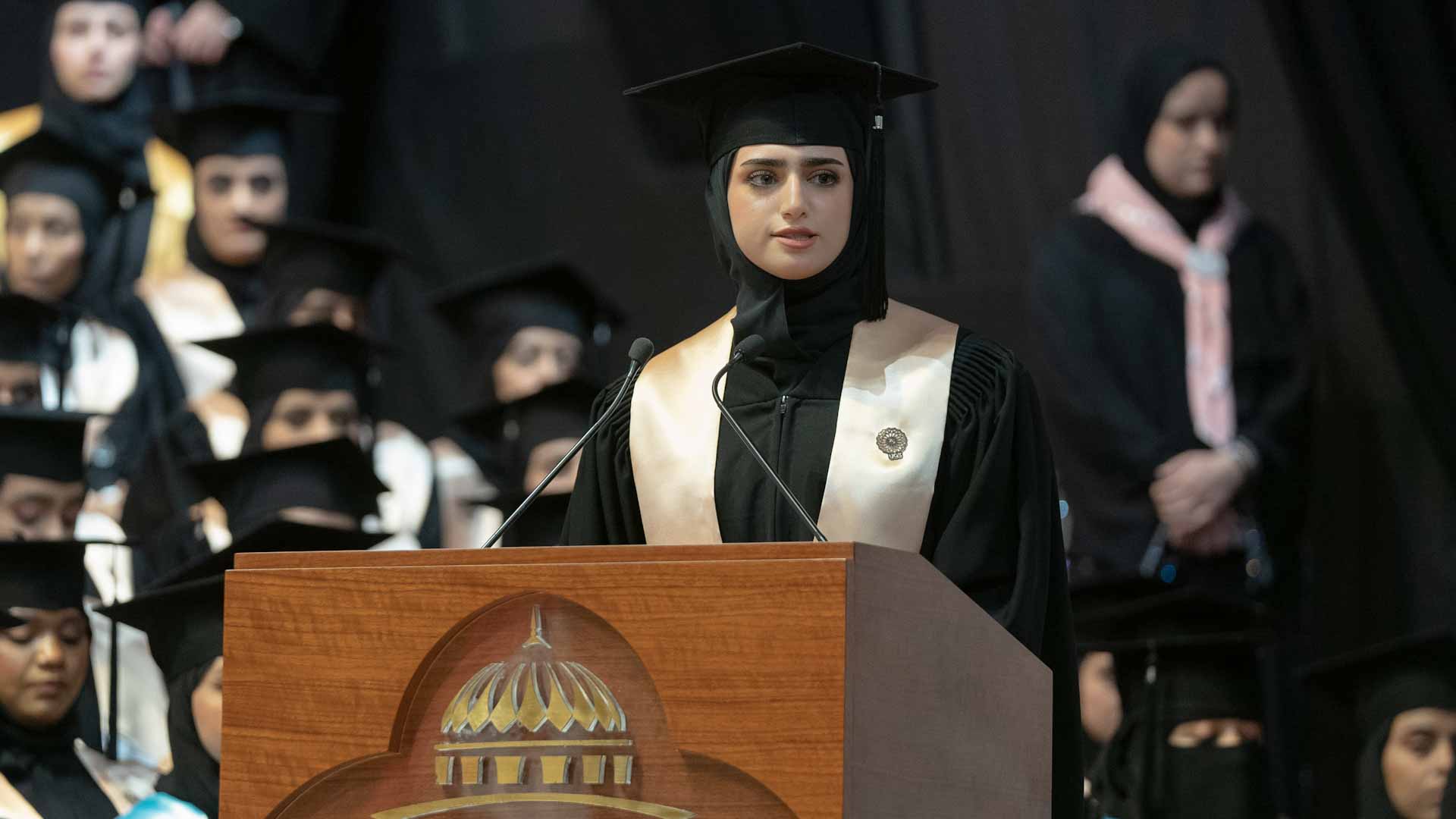 وألقت الخريجة أسماء الزرعوني كلمة نيابة عن زميلاتها الخريجات قدمت فيها الشكر والعرفان إلى صاحب السمو حاكم الشارقة على رعاية سموه الكريمة الذي عمل وقدم وأنشأ وبنى صروح العلم لأبنائه وبناته لينهلوا من العلوم والمعارف.