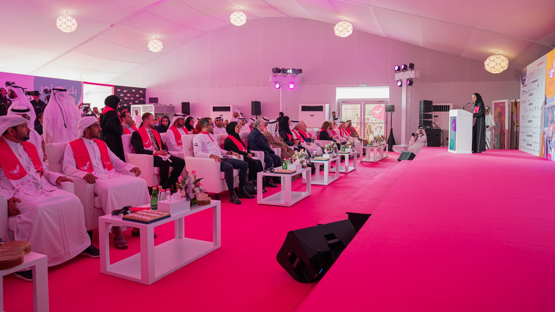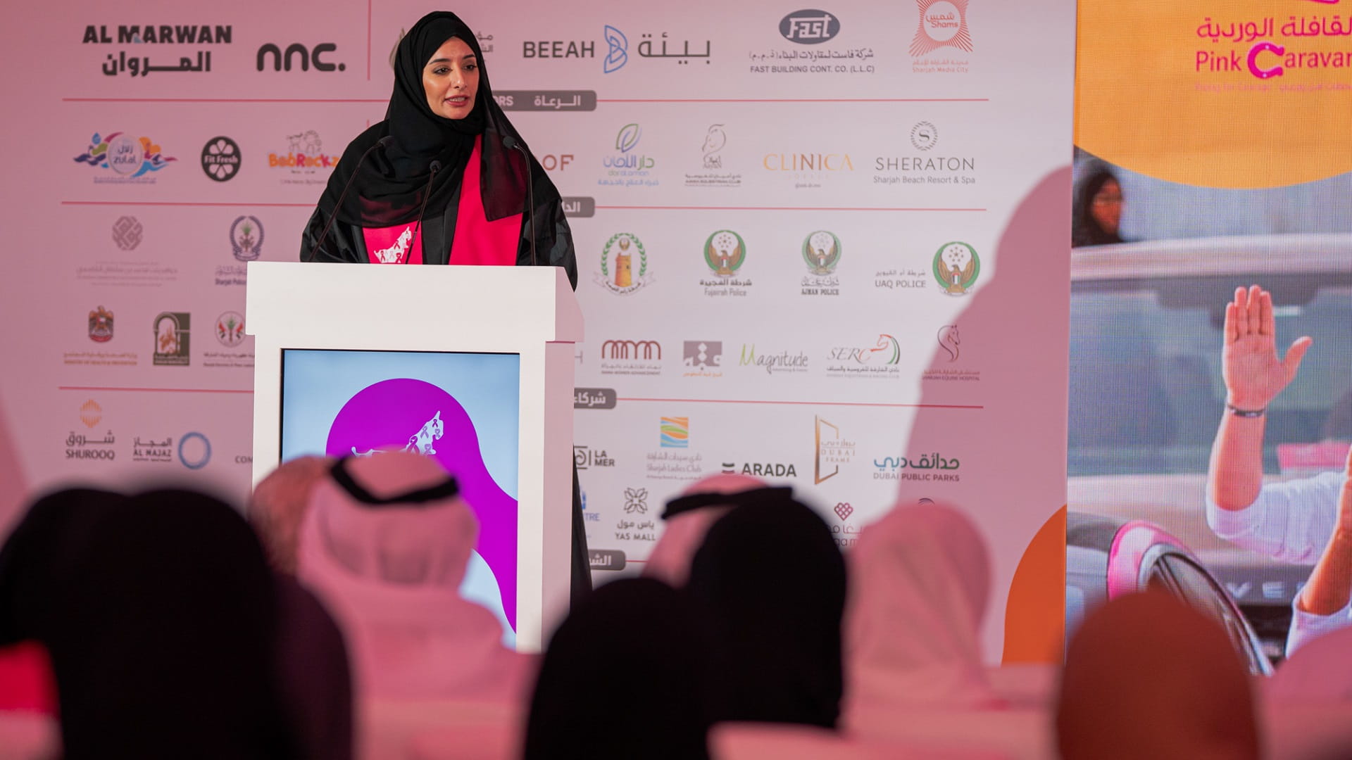 وألقت ريم بن كرم، رئيس اللجنة العليا المنظمة لمسيرة فرسان القافلة الوردية كلمةً استعرضت فيها أبرز أهداف وإنجازات القافلة قائلةً: "إن ما تقدمه المسيرة من نموذج للعمل المؤسسي في النهوض بالوعي لحماية صحة أفراد المجتمع، عبر التأكيد على أهمية الفحص المبكر وضرورة الفحص الدوري لسرطان الثدي، لم يعد حدثاً سنوياً، وإنما ثقافة يعيشها المجتمع الإماراتي كلما لمح خيلاً ترفع الراية الوردية".