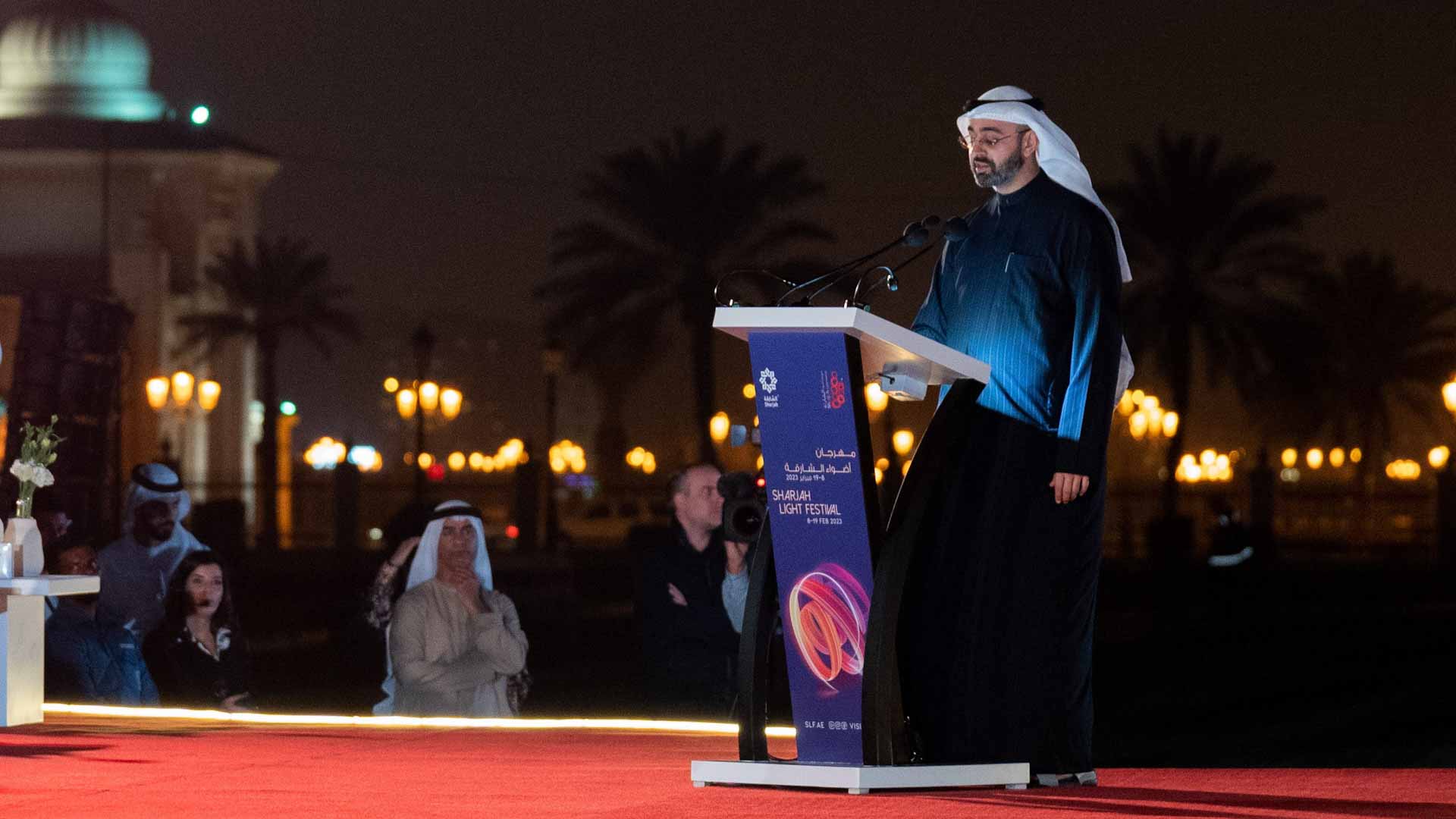 ثم ألقى خالد جاسم المدفع رئيس هيئة الإنماء التجاري والسياحي كلمة، أكد فيها أن مهرجان أضواء الشارقة يواصل مسيرة التميز والابتكار، من خلال التحديث المستمر للرؤى والوسائل والأفكار التي يقدمها، بالإضافة إلى تطوير كافة التقنيات، من أجل التكيف مع التغيرات المتجددة وضمان استدامة النتائج والمخرجات الإيجابية، مشيراً إلى حرص الهيئة في كل عام على تجديد العروض وتطوير الفعاليات المصاحبة، واستقطاب أشهر الفنانين العالميين، لتسليط الضوء على أحدث الوجهات والمعالم في إمارة الشارقة، فضلاً على تقديم المزيد من الخدمات للجمهور في كل موقع من مواقع المهرجان.