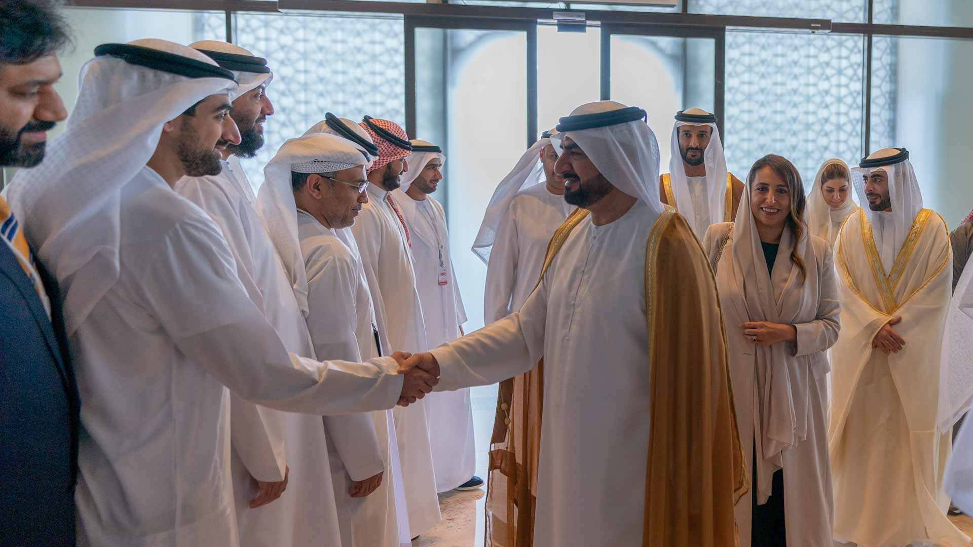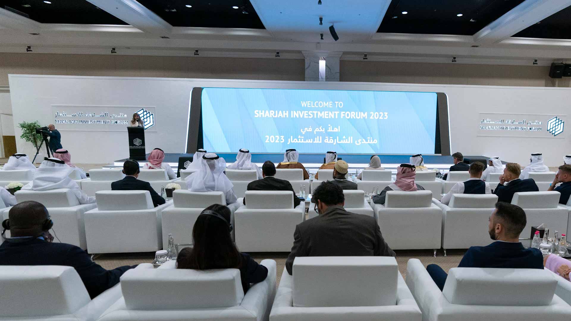 وكان في استقبال سمو نائب حاكم الشارقة لدى وصوله كل من الشيخ خالد بن عبد الله القاسمي رئيس هيئة الشارقة للموانئ والجمارك والمناطق الحرة، والشيخة بدور بنت سلطان القاسمي رئيسة هيئة الشارقة للاستثمار والتطوير "شروق"، والشيخ سالم بن عبد الرحمن القاسمي رئيس مكتب سمو الحاكم، والشيخ سعود بن سلطان بن محمد القاسمي مدير مكتب الشارقة الرقمية، والشيخ فيصل بن سعود القاسمي مدير هيئة مطار الشارقة الدولي، والشيخ سعود بن محمد بن سعود القاسمي الرئيس التنفيذي لقطاع العقارات في الشارقة لإدارة الأصول، ومعالي عبد الله بن طوق المري وزير الاقتصاد وعدد من كبار المسؤولين رؤساء الدوائر الحكومية وممثلي المنظمات والشركات والمستثمرين.