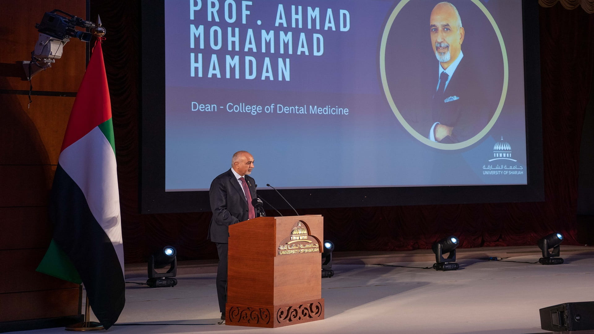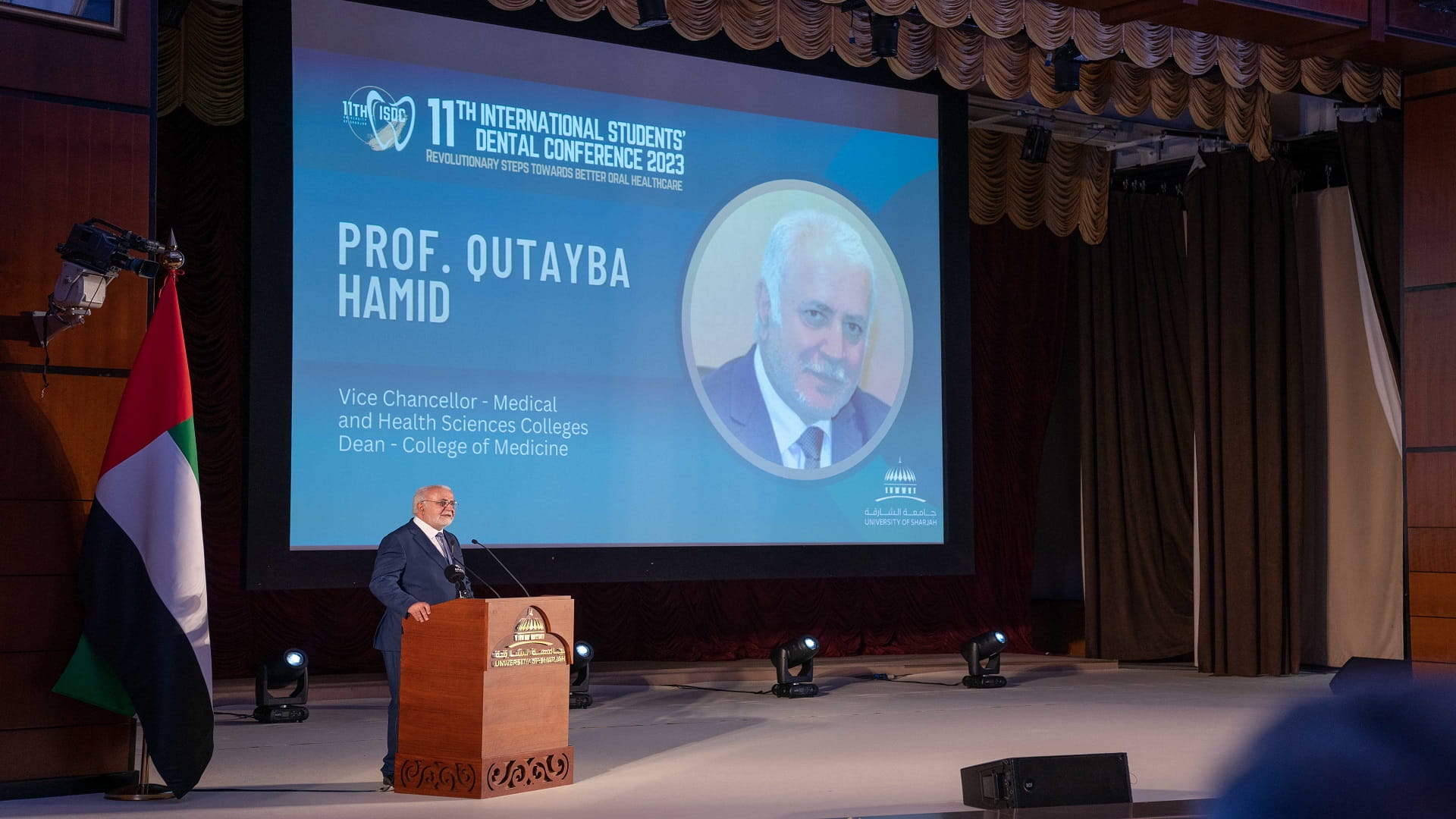 وقال: "يسلط المؤتمر الضوء على النظرة الدولية للجامعة، حيث ينعكس من خلال ترتيبها بين أفضل 301-351 جامعة في العالم، والسابعة على مستوى العالم العربي والأولى في الإمارات العربية المتحدة هذا العام طبقاً لتصنيف مؤسسة التايمز للتعليم العالي المتخصصة بتصنيف الجامعات على مستوى العالم لعام 2023م، كذلك صنفت كلية طب الأسنان من بين أفضل 200 جامعة عالمياً، بالإضافة إلى ذلك، حصل مستشفى الأسنان الجامعي بالشارقة (UDHS) كأول مستشفى أسنان في العالم على الاعتماد الماسي من اعتماد Qmentum (كيومينتوم) الدولي في كندا، بعد تحقيق معدل 99.4٪ من معايير التقييم البالغ عددها 261، والذي يمثل علامة التميز في ضمان الجودة وسلامة المرضى".