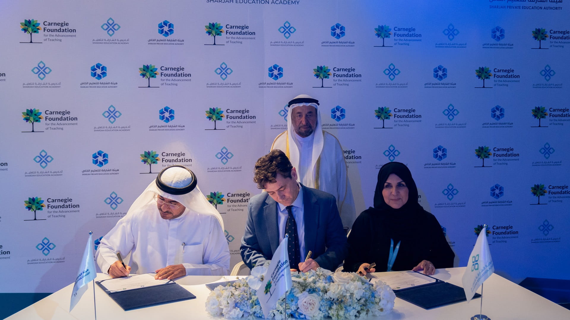 وتم توقيع الوثيقة بين أكاديمية الشارقة للتعليم، وهيئة الشارقة للتعليم الخاص، ومؤسسة كارنيجي للنهوض بالتعليم، ووقعها كل من: الدكتورة محدثة الهاشمي رئيسة الأكاديمية، وعلي الحوسني مدير الهيئة، والدكتور تيموثي نولز رئيس المؤسسة.