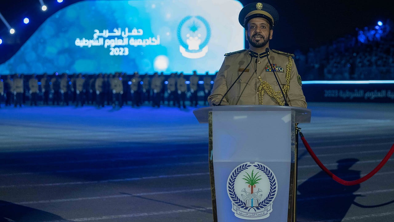 استهل حفل التخريج الذي أقيم على ميدان أكاديمية العلوم الشرطية في الشارقة بالسلام الوطني لدولة الإمارات العربية المتحدة تلاه دخول الخريجين لميدان التخريج، عقبه تلاوة آيات من الذكر الحكيم، ألقى بعدها العميد الدكتور محمد خميس العثمني مدير عام أكاديمية العلوم الشرطية في الشارقة كلمة رحب في مستهلها بسمو ولي العهد والحضور، مشيراً إلى أن دولة الإمارات العربية المتحدة تبذل تحت ظل قيادتها الرشيدة كل جهدها وتوظف كل طاقاتها لتحسين جودة الحياة الأمنية والمعيشية للمواطن والمقيم، والارتقاء بالبلاد لتصبح في مصاف الدول المتقدمة من حيث حجم التطور والازدهار والنماء في شتى نواحي الحياة.