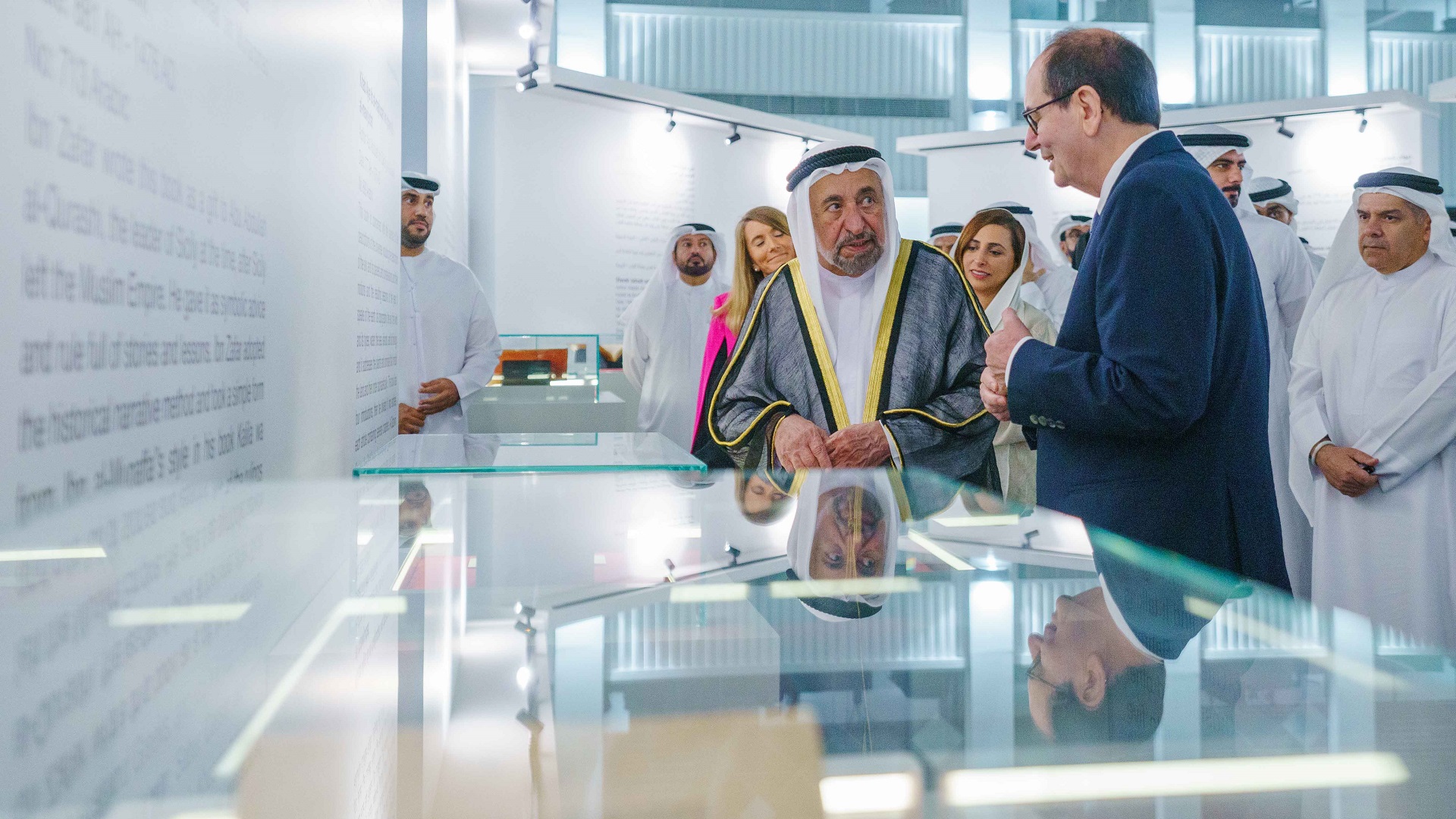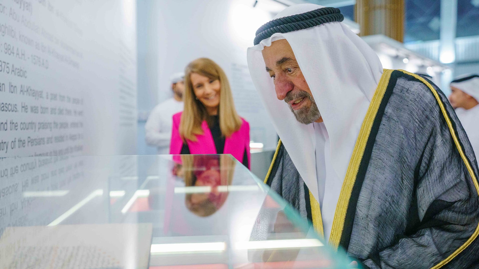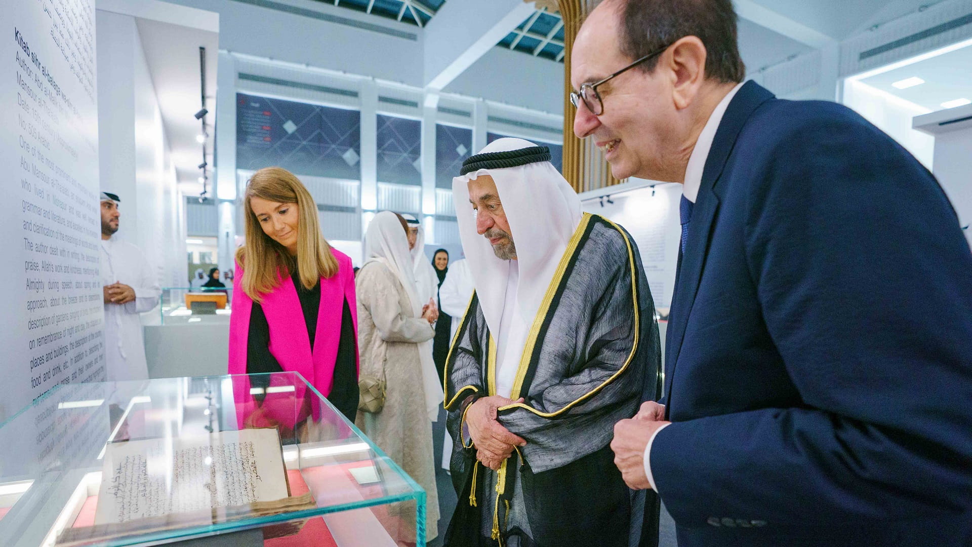وتجول سموه، في أقسام المعرض الذي يضم 14 مخطوطة، يعود تاريخها إلى الفترة الزمنية الواقعة بين القرنين الثالث عشر والسادس عشر الميلادي، مستمعاً سموه، إلى شرح مفصل حول تاريخ المخطوطات ومضامينها وسير مؤلفيها.