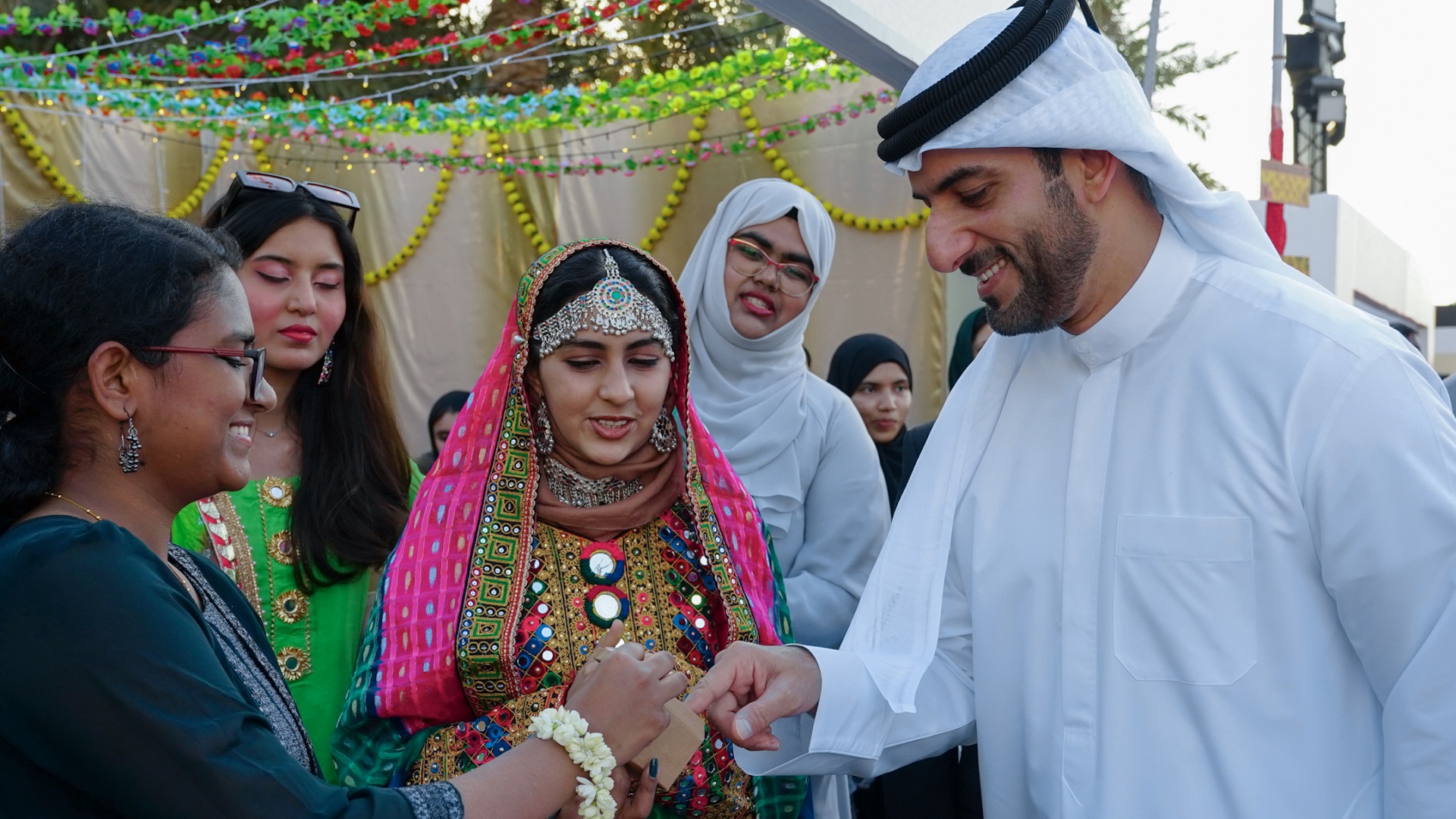وتجول سموه في أروقة الأجنحة المشاركة ضمن الفعاليات، والتي تضم 24 دولة من مختلف دول العالم قدم خلالها الطلبة تعريفاً بالثقافات المحلية لكل دولة مع عروض فنية ومعلوماتية للتعريف بها، ومكونات تراثها الثقافي والحضاري مع تقديم العديد من المأكولات الشعبية والفقرات الفلكلورية لتلك الدول.