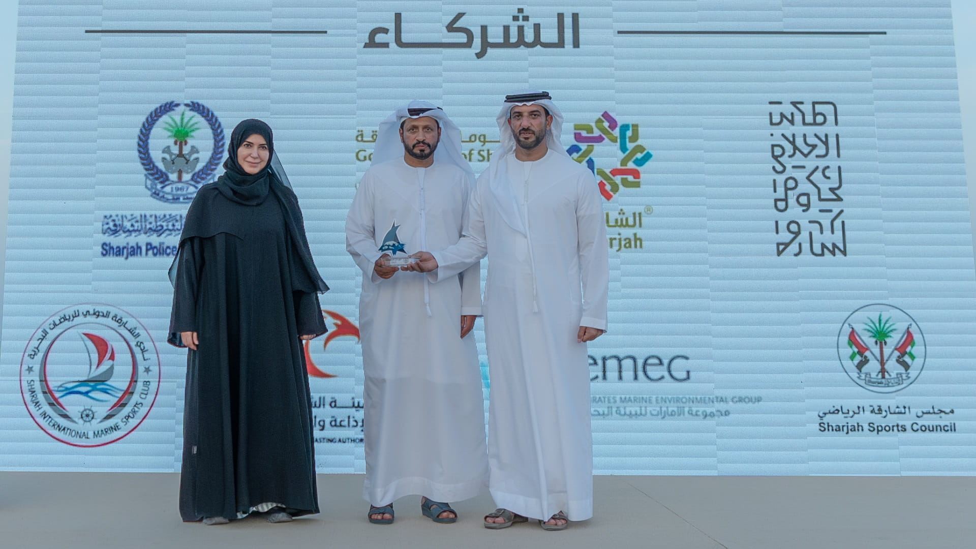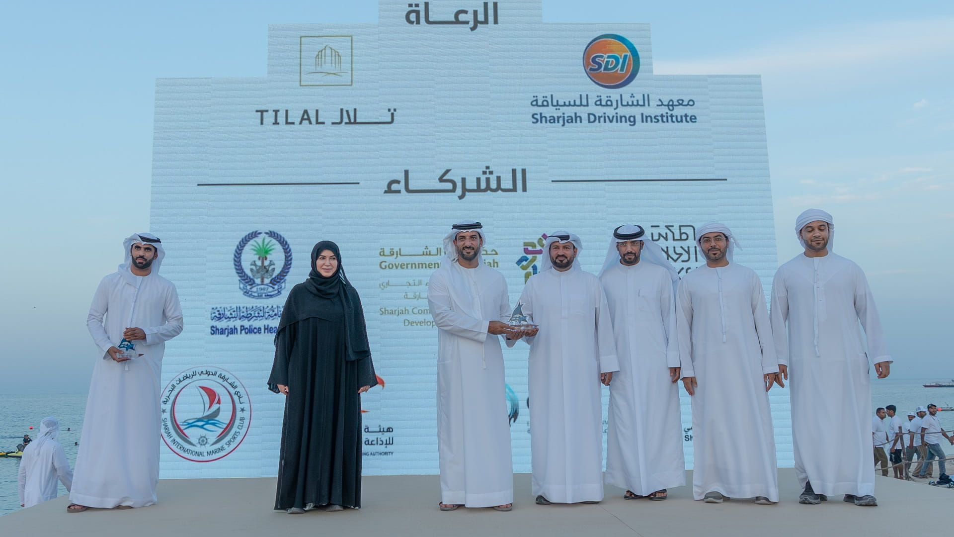 وتفضل سموه، بتكريم الجهات الراعية للمهرجان وهم هيئة الإنماء التجاري والسياحي، والقيادة العامة لشرطة الشارقة، وهيئة الشارقة للإذاعة والتلفزيون، والمكتب الإعلامي لحكومة الشارقة، ونادي الشارقة الدولي للرياضات البحرية، ومجلس الشارقة الرياضي، وتلال العقارية، ومعهد الشارقة للسياقة، ومجموعة الإمارات للبيئة البحرية، مهدياً سموه إياهم الدروع وملتقطاً معهم الصور التذكارية.
