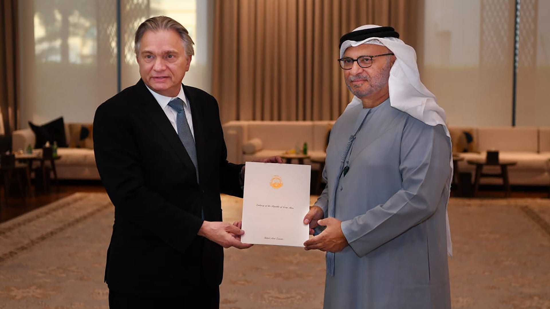 سلم الرسالة إلى الرئيس سعادة روضة محمد العتيبة، سفيرة الدولة لدى جمهورية كوستاريكا.