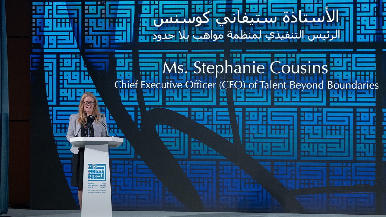 وتناولت المديرة التنفيذية لمنظمة مواهب بلا حدود في كلمتها نجاحات المنظمة حيث ساهمت في مساعدة أكثر من 1200 لاجئ على إيجاد حلول مستدامة لحالات نزوحهم، والتي اعتبرتها جزءاً صغيراً بالمقارنة مع الإنجازات التي ستتحقق مستقبلاً بدعم كريم من إمارة الشارقة، مؤكدةً أنه لا يمكن لمؤسسة واحدة أن تجد حلاً لقضية اللاجئين والنازحين معاً، كون هذه القضية تتطلب جهوداً جماعية وتغييرات جذرية في الأنظمة والممارسات، مهديةً هذه الجائزة للاجئين والنازحين قسراً في جميع أنحاء العالم ممن يسعون لممارسة مهنهم وتحقيق أحلامهم في أحلك الظروف والتحديات، واعدةً إياهم بأن المنظمة سوف تبني عالماً يمكن للنازحين واللاجئين فيه أن يهاجروا للعمل بأمان وسلام.