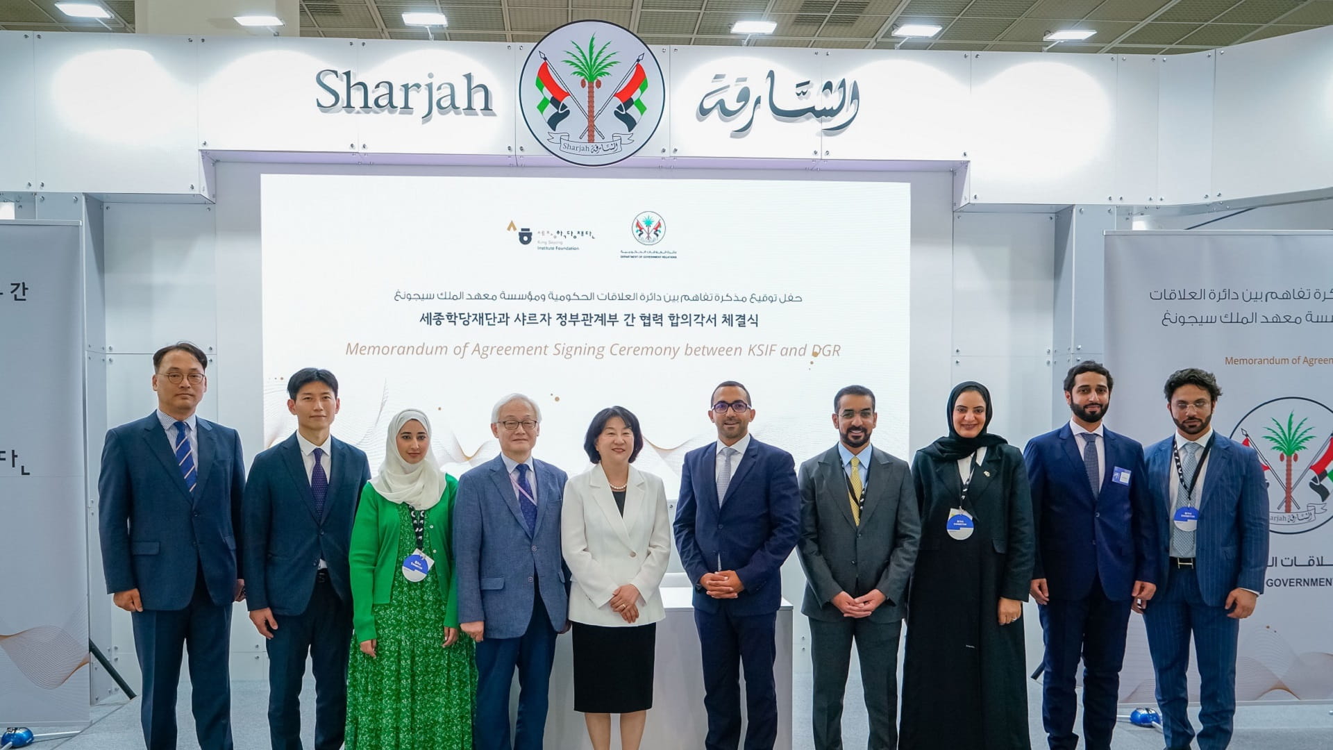 وقع الاتفاقية من جانب دائرة العلاقات الحكومية بالشارقة، الشيخ فاهم القاسمي، مدير الدائرة، ومن الجانب الكوري، لي هيه-يونغ، رئيسة معهد الملك سيجونغ، بحضور عدد من المسؤولين والشخصيات الثقافية والإعلامية من الجانبين.