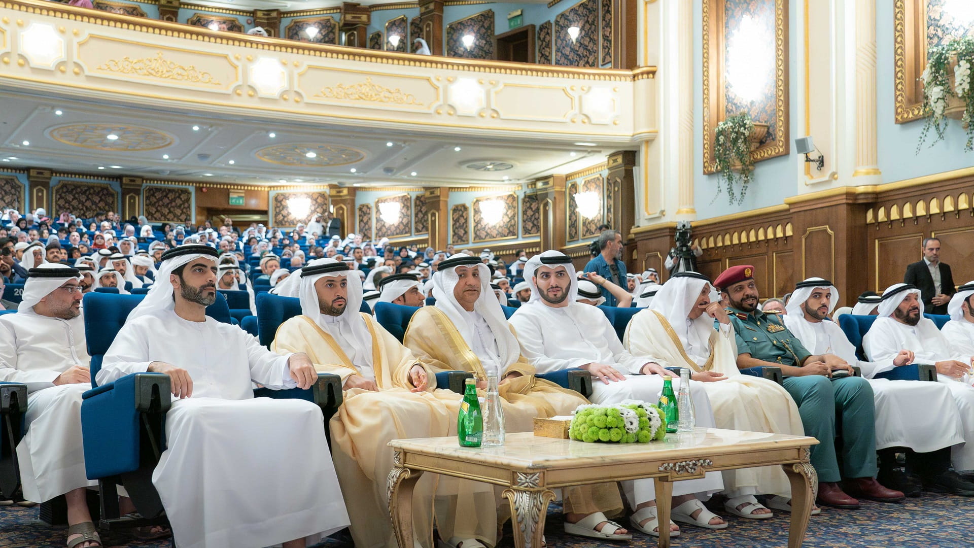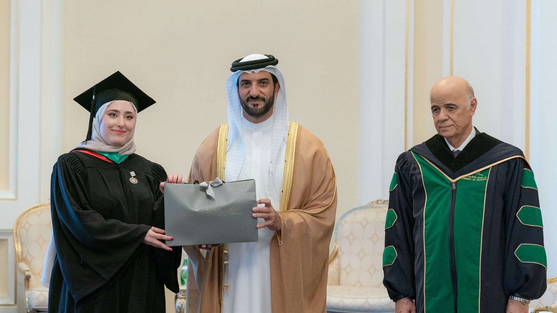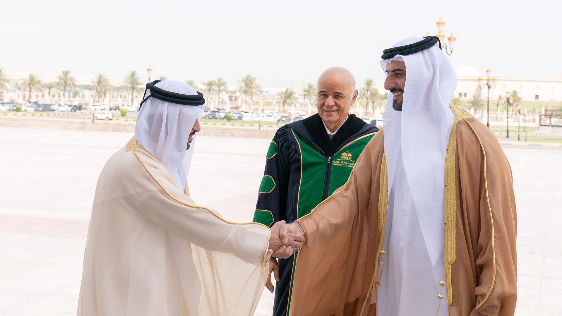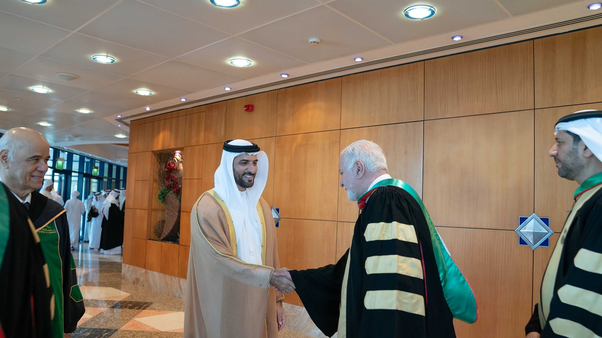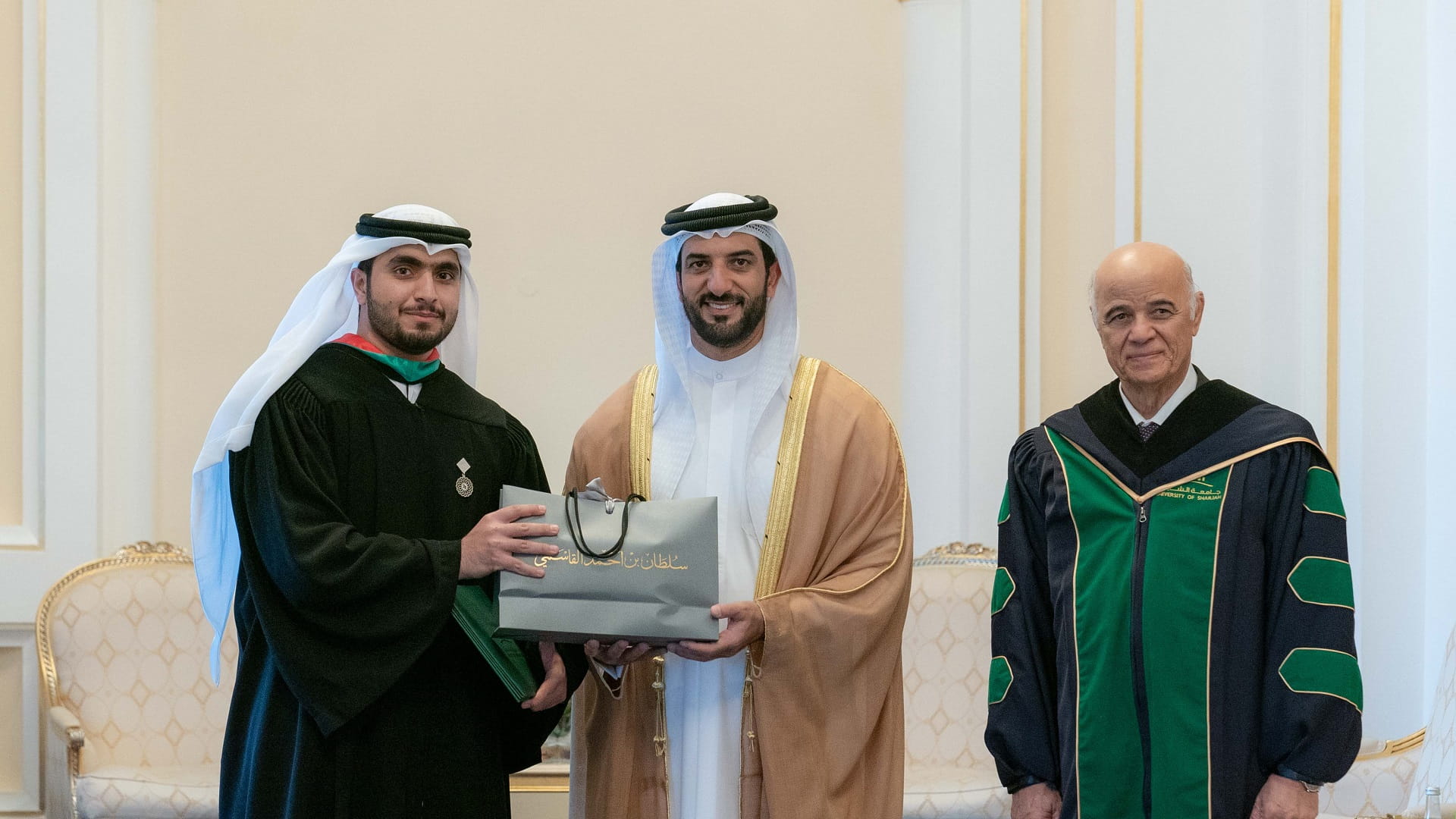 وتفضل سمو الشيخ سلطان بن أحمد بن سلطان القاسمي، بتسليم الخريجين طلبة الدراسات العليا شهاداتهم مهنئاً إياهم بالتخرج.