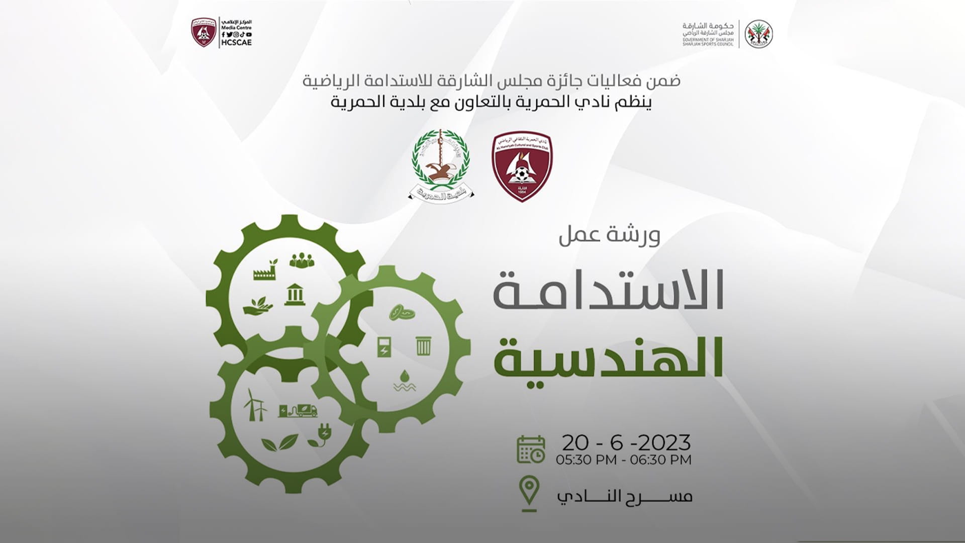 تُنظم لجنة الاستدامة بنادي الحمرية الثقافي الرياضي، الثلاثاء المقبل، ورشة عمل تحت عنوان "الاستدامة الهندسية"، وذلك بالتعاون مع بلدية الحمرية.