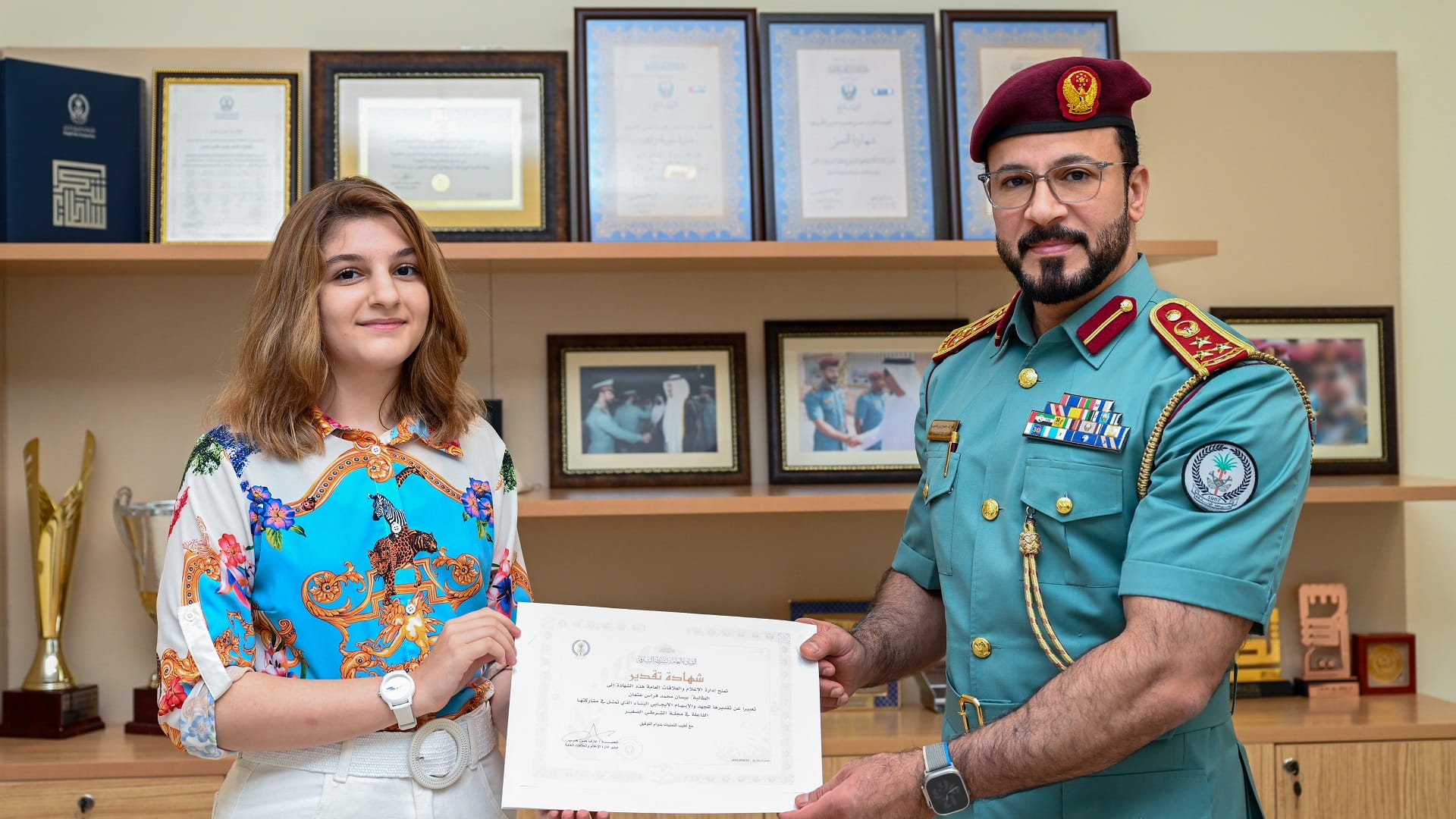 كرّم العميد عارف حسن هديب مدير إدارة الإعلام والعلاقات العامة بشرطة الشارقة، الطالبة بيسان محمد فراس عثمان، تقديراً لتعاونها المثمر مع إدارة الإعلام والعلاقات العامة، الذي تمثل في إثراء مجلة الشرطي الصغير، بالمواضيع العلمية والثقافية للطفل، ومشاركتها في الفعاليات والمعارض المحلية والدولية التي تشارك بها شرطة الشارقة.