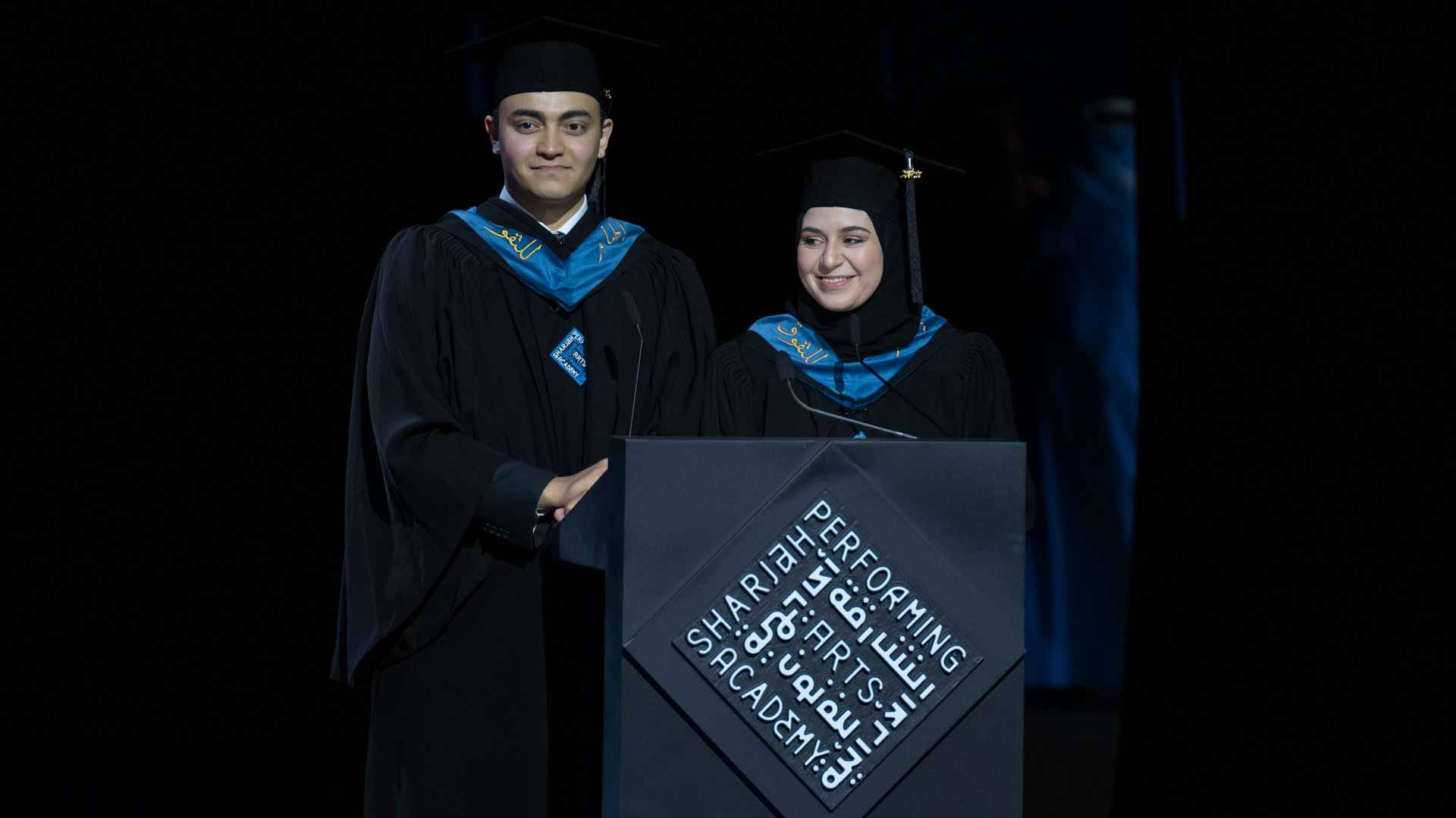 وقدما خلال الكلمة الشكر والتقدير إلى صاحب السمو حاكم الشارقة، على منح الفرصة للشباب العربي لدراسة المسرح وتطوير مواهبهم من خلال هذه الأكاديمية المتفردة، قائلين: "تعد أكاديميتنا الأولى من نوعها في دولة الإمارات العربية المتحدة التي قدمت هذا التخصص لمنح الفرص للشباب لإطلاق العنان لمواهبهم، وإبراز قيمة المسرح في العالم العربي، وهنا يرجع الفضل في جعل المستحيل ممكناً إلى القائد والمؤسس والداعم لأحلام الشباب وجميع المسرحيين العرب، صاحب السمو الشيخ الدكتور سلطان بن محمد القاسمي، رمز الهوية العربية وبالنيابة عن زملائنا نقول لسموه شكراً على دعمكم واهتمامكم الكبير لتطوير الفنون والثقافة في الوطن العربي الكبير، وشكراً من القلب لأن سموكم جعل لأحلامنا المستحيلة شرفات تطل على الكون من خلال المسرح".