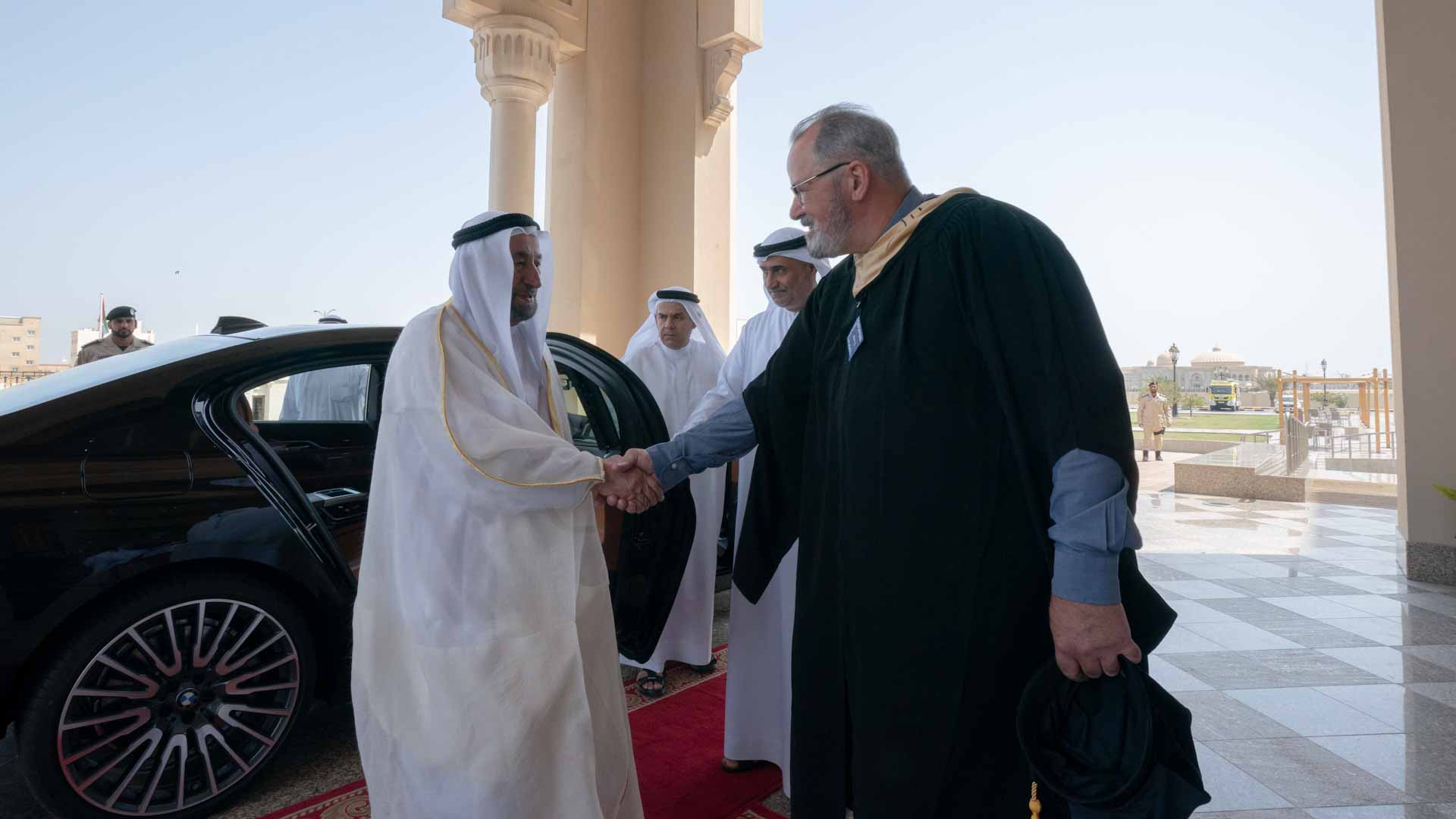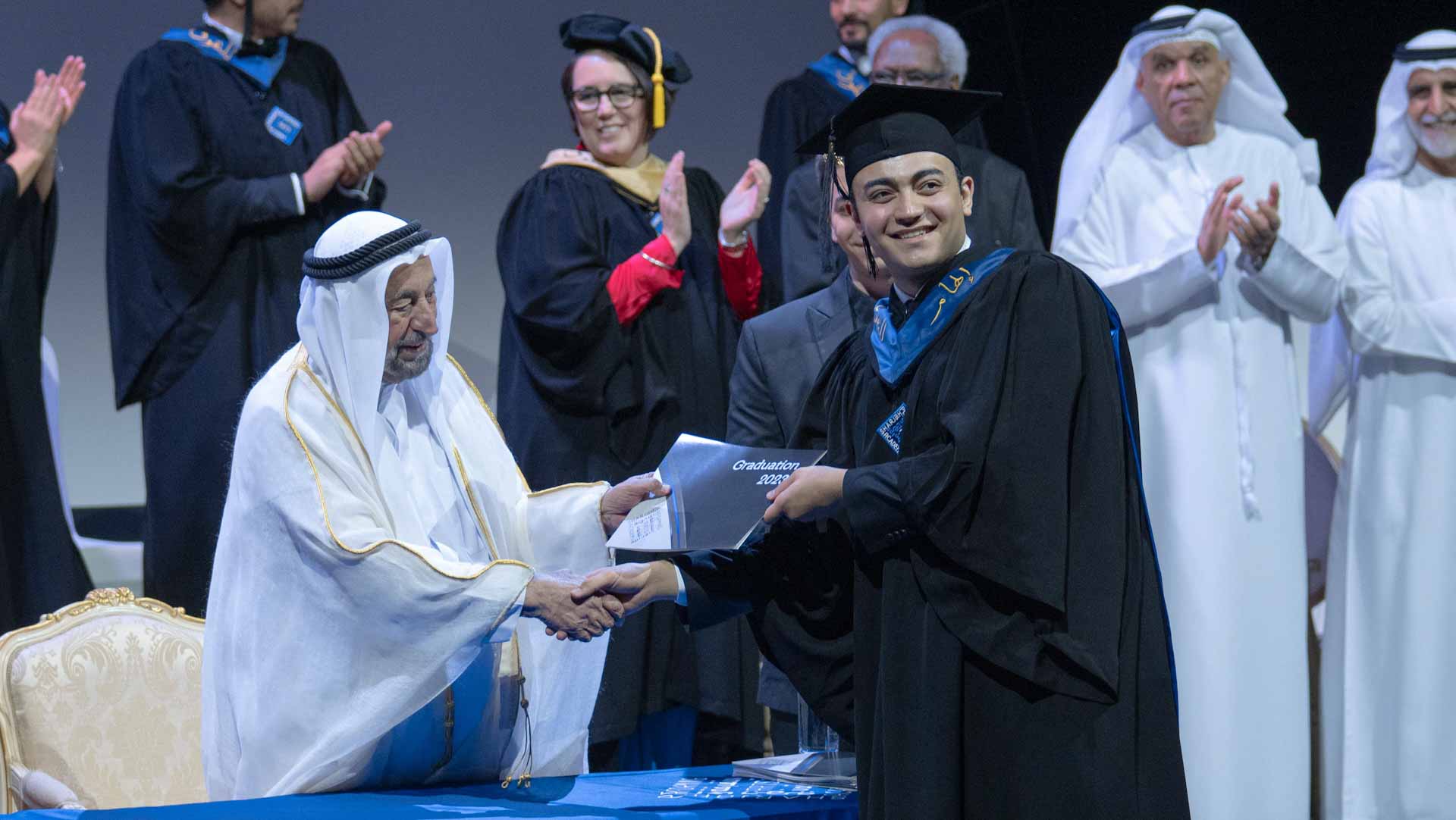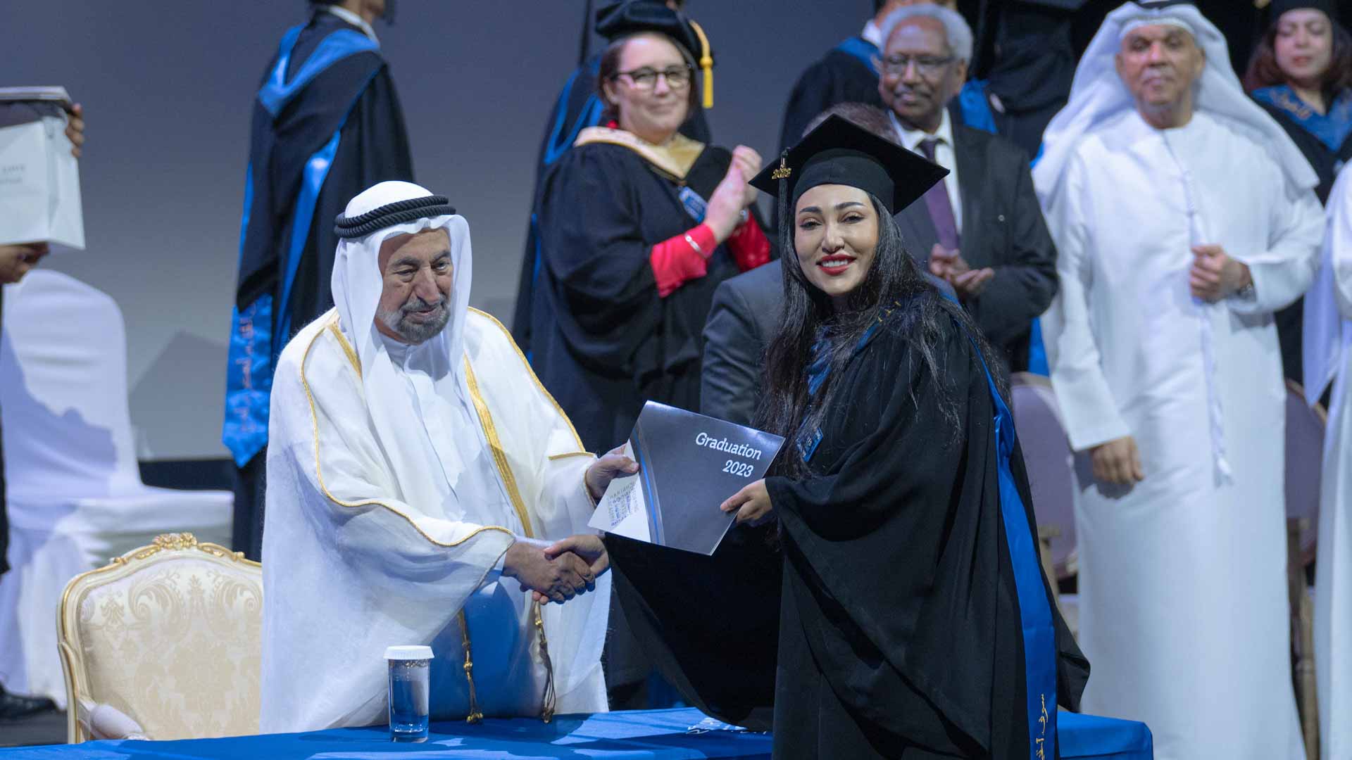 وتفضل صاحب السمو حاكم الشارقة بتسليم الخريجين شهاداتهم الدراسية، ملتقطاً معهم الصور التذكارية، ومهنئاً إياهم التفوق والنجاح ومتمنياً لهم التوفيق في حياتهم العملية.