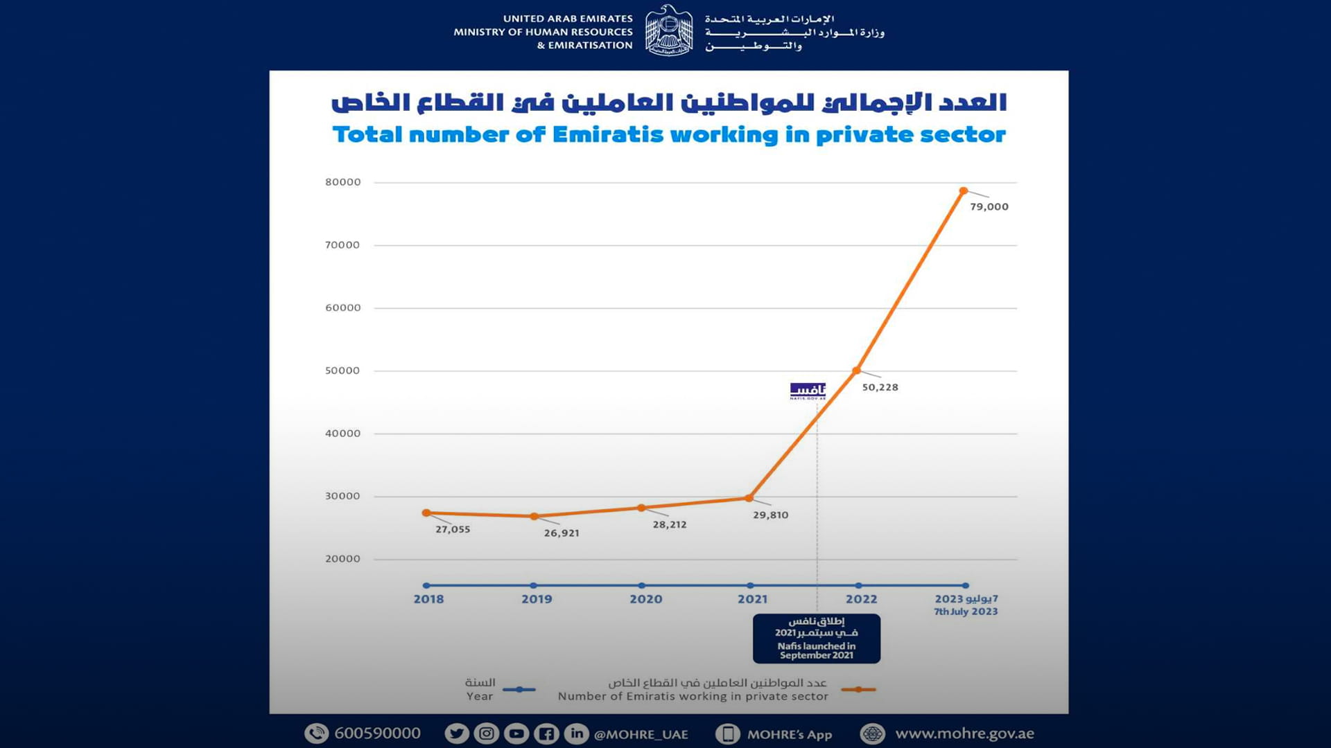 أعلنت وزارة الموارد البشرية والتوطين، اليوم الأحد، أن عدد المواطنين العاملين في القطاع الخاص بنهاية مهلة مستهدفات التوطين نصف السنوية لشركات القطاع الخاص التي يعمل لديها 50 موظفاً فأكثر بلغ نحو 79 ألفاً، وذلك بزيادة نسبتها 57% مقارنةً بالأعداد التي تم الإعلان عنها بنهاية 2022 والتي بلغت 50.228 مواطناً.