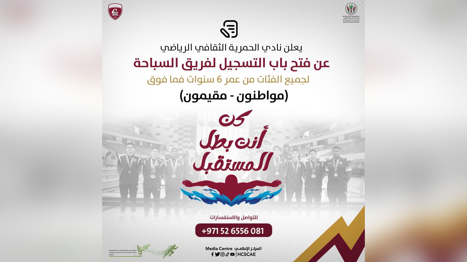 أما رياضة السباحة، فالتسجيل مفتوح أمام المواطنين والمقيمين، وفي كل الفئات، بدءاً من 6 سنوات فما فوق.