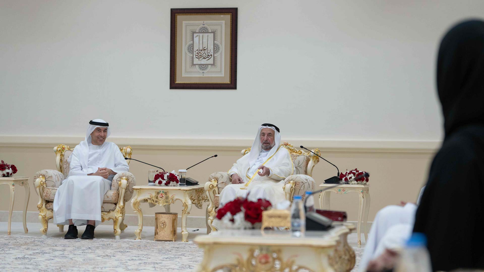 حضر الاستقبال بجانب صاحب السمو حاكم الشارقة كل من: سعادة عمر بن حريمل الشامسي رئيس دائرة الموارد البشرية، وسعادة محمد عبيد الزعابي رئيس دائرة التشريفات والضيافة، وسعادة محمد عبد الله الرئيس التنفيذي لمصرف الشارقة الإسلامي، وعدداً من أعضاء مجلس إدارة معهد الامارات المالي.