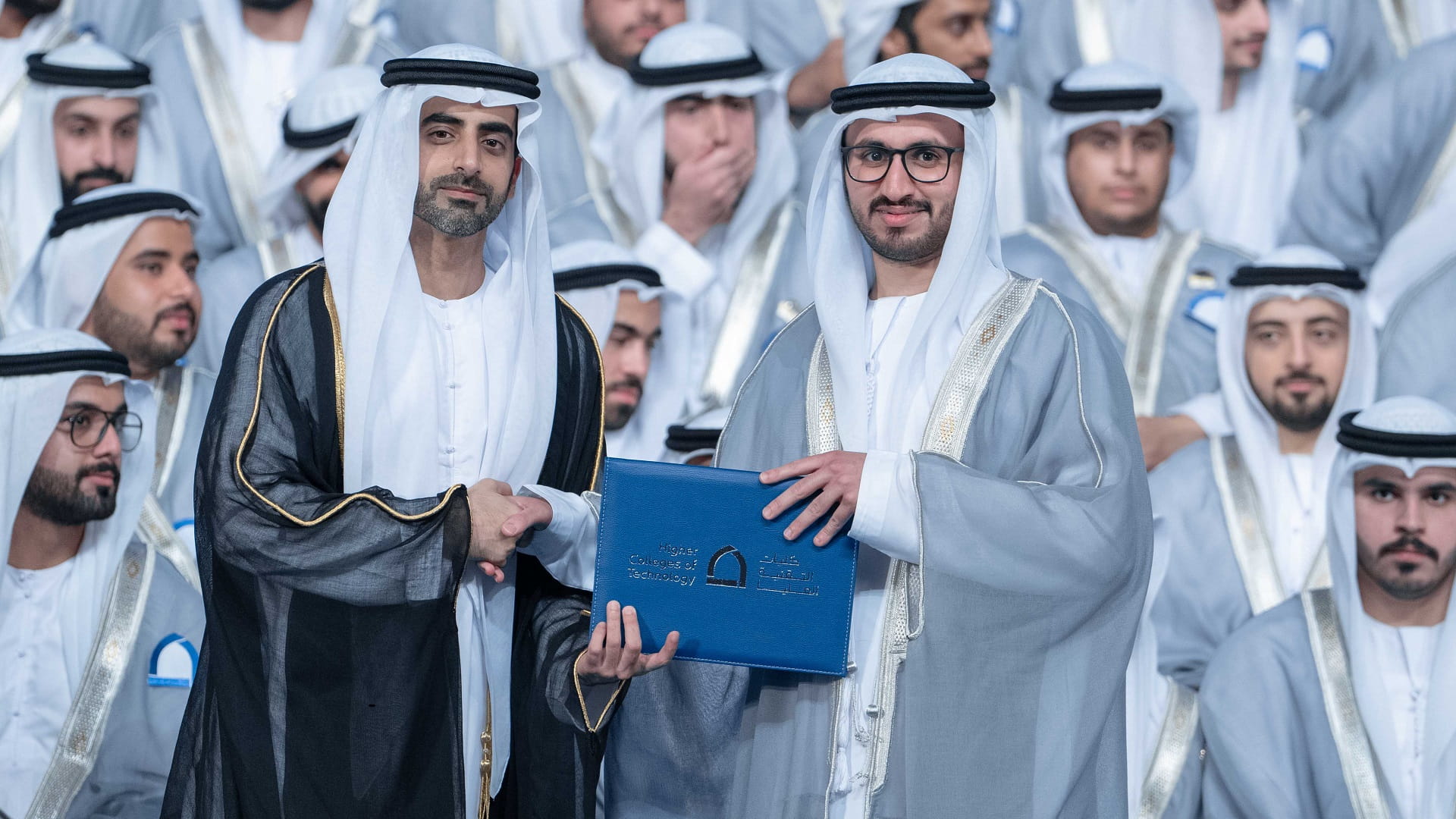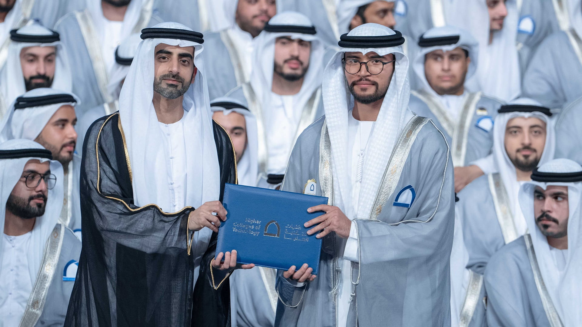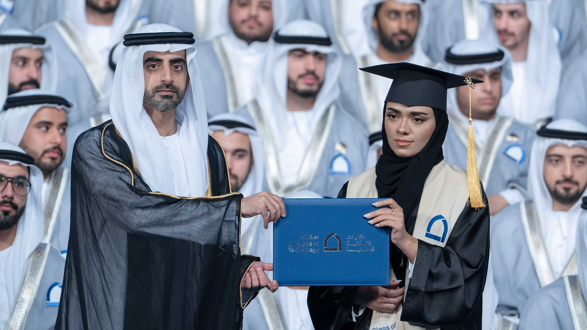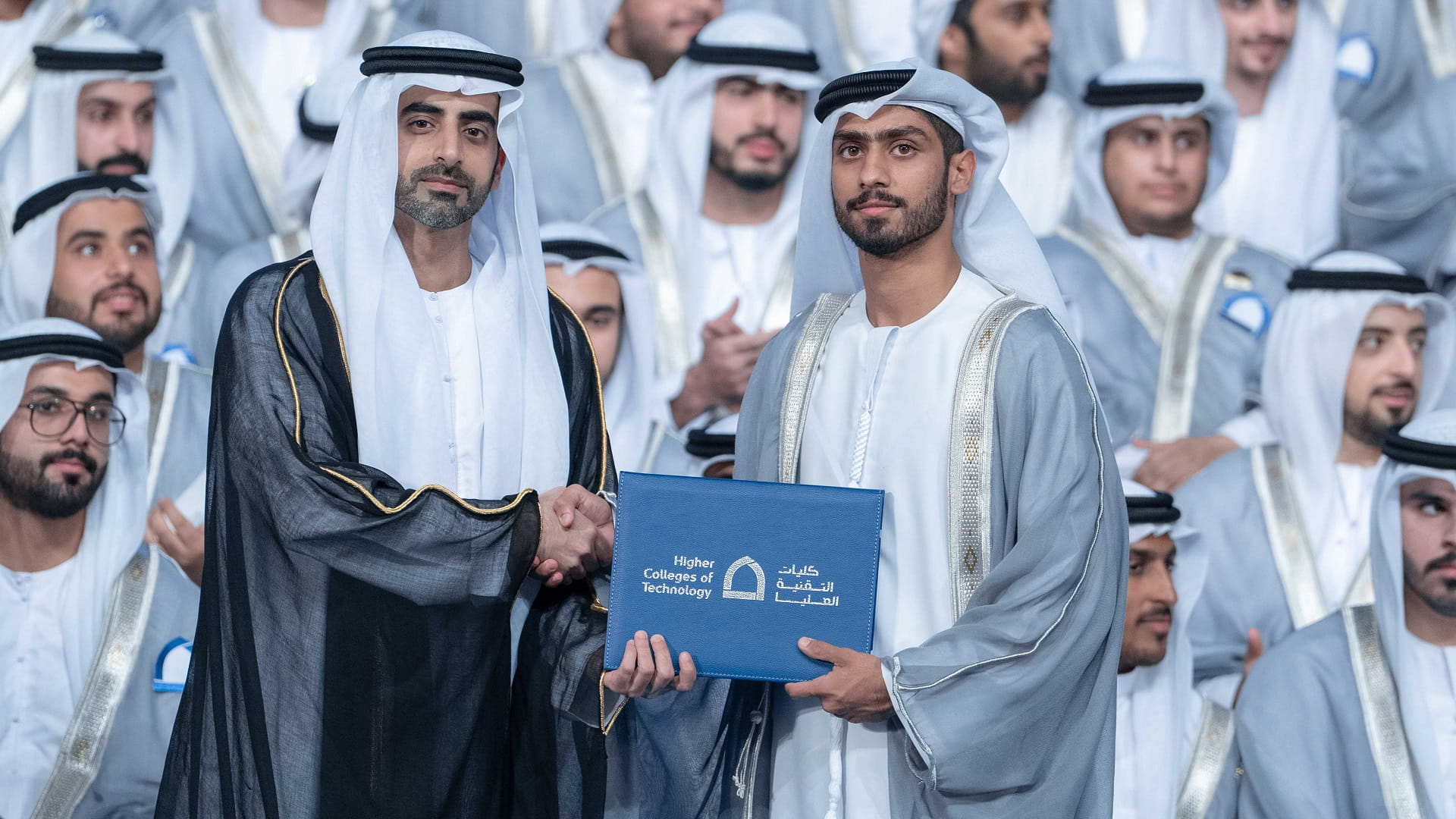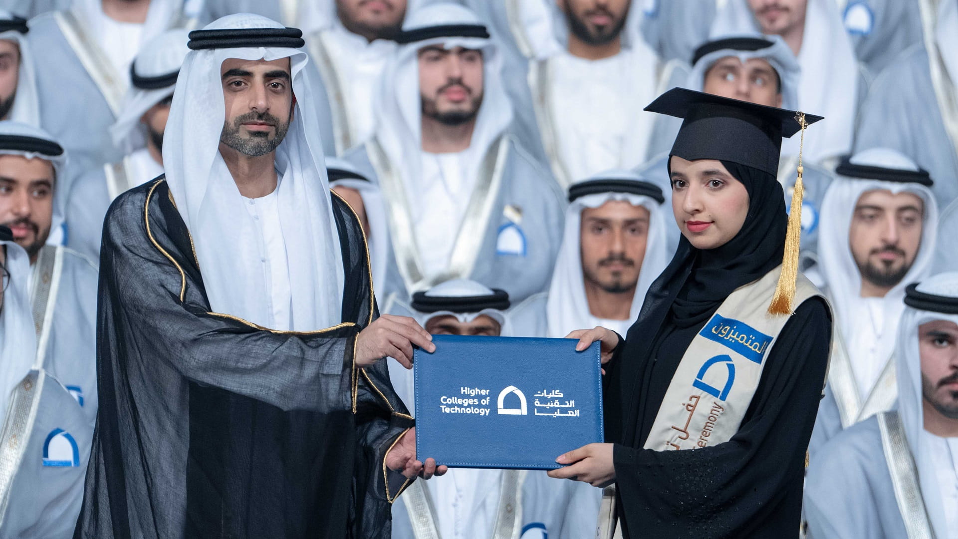 وتفضل الشيخ سالم بن عبد الرحمن القاسمي، في ختام حفل التخرج، بتسلم هدية تذكارية من إدارة كليات التقنية العليا، التي أعربت عن شكرها وتقديرها لتشريفه الحفل وتكريم الخريجين والخريجات.
