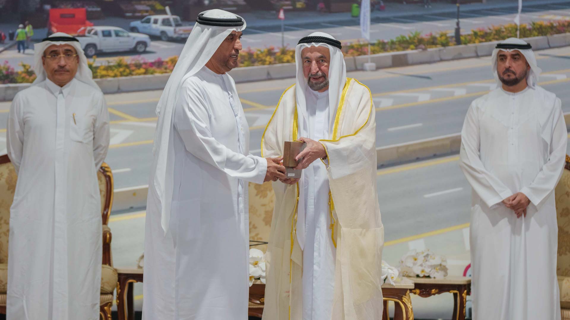 وسلم صاحب السمو حاكم الشارقة المواطنين من أهالي منطقتي شيص والنحوة سندات ملكية محلاتهم التجارية في استراحة شيص مهنئاً إياهم ومتمنياً لهم التوفيق والبركة في الرزق.