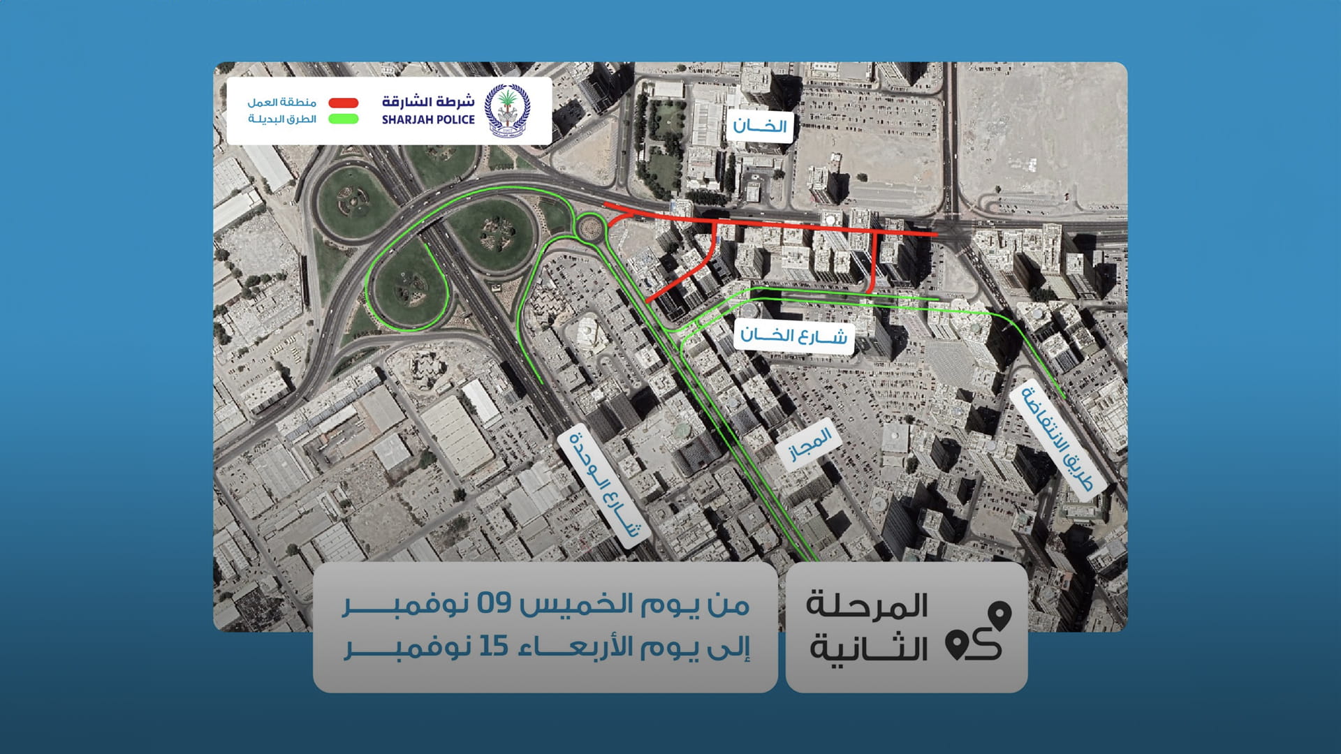 كشفت هيئة الطرق والمواصلات في الشارقة، عن تنفيذ إغلاق جزئي على طريق الخان، كما هو موضح في المخطط، وذلك استكمالاً لأعمال صيانة ورفع كفاءة الطريق على مرحلتين: المرحلة الأولى من الجمعة 3 نوفمبر إلى الأربعاء 8 نوفمبر، والمرحلة الثانية من الخميس 9 نوفمبر إلى الأربعاء 15 نوفمبر.
