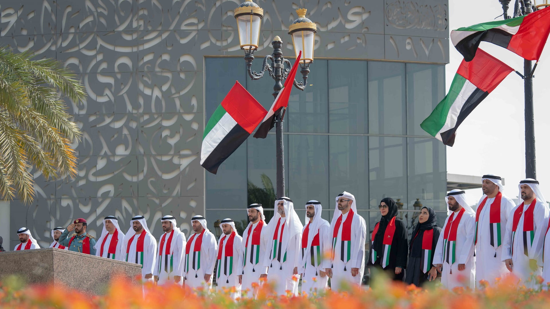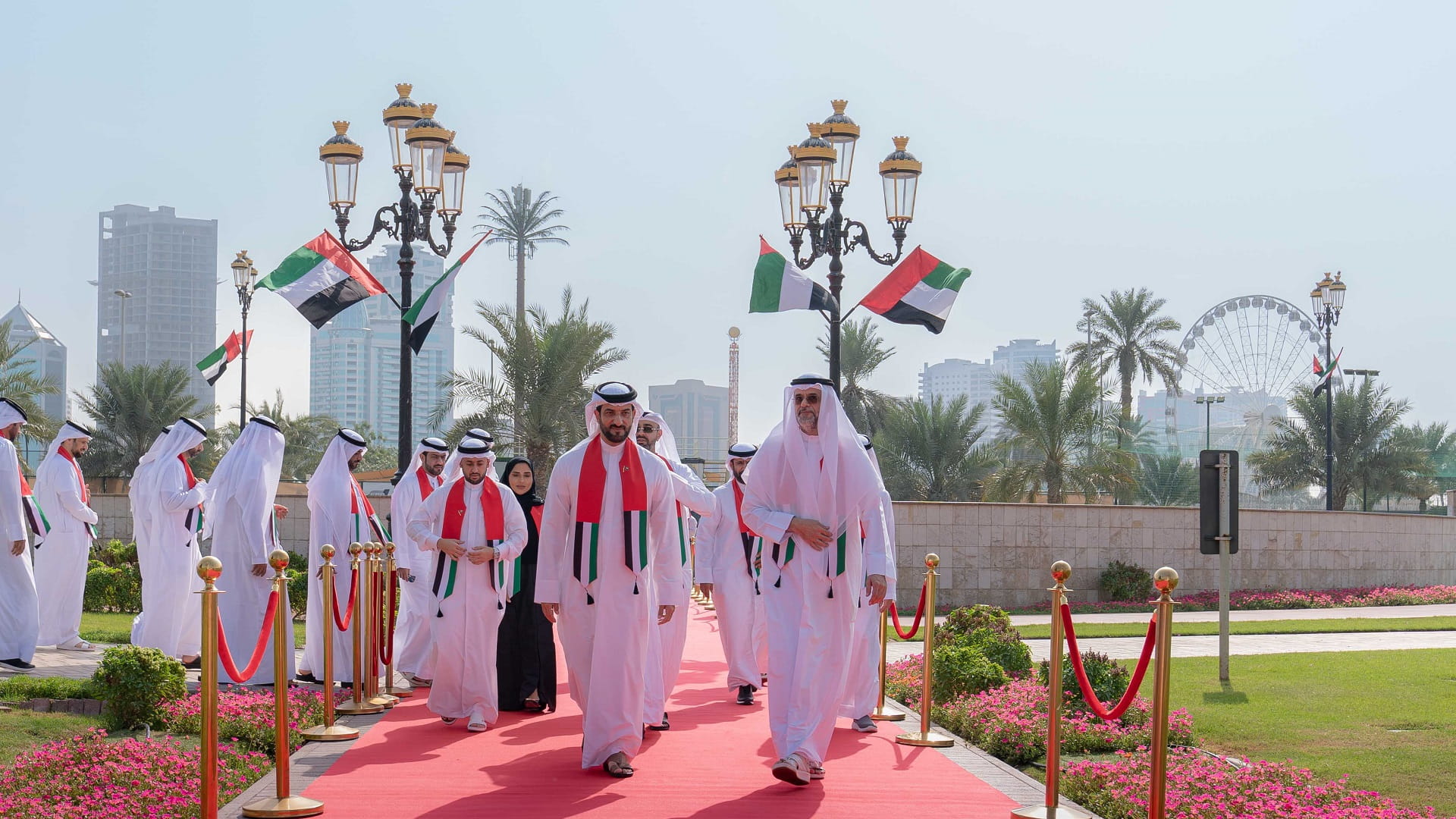 وتفضل سمو ولي عهد الشارقة وعند تمام العاشرة عشرة صباحاً، بالإيذان ببدء مراسم رفع العلم، بمشاركة ضباط وأفراد من القيادة العامة لشرطة الشارقة والفرقة الموسيقية العسكرية لأكاديمية العلوم الشرطية بالشارقة التي عزفت السلام الوطني لدولة الإمارات العربية المتحدة، حيث ارتفع علم البلاد عالياً في سماء الوطن، اعتزازاً بيوم العلم.