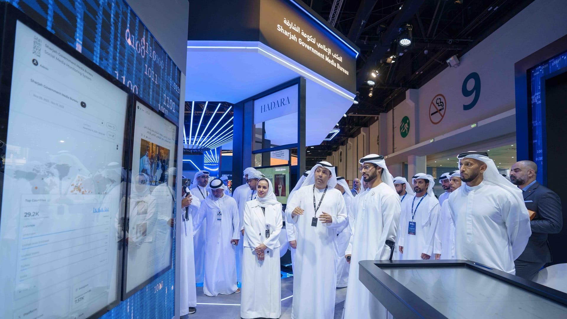 واستمع سموه لشرح حول "منصة الإعلام الذكي" إحدى مبادرات المكتب الإعلامي لحكومة الشارقة، من قِبل سعادة طارق سعيد علاي مدير عام المكتب الإعلامي لحكومة الشارقة، وسعادة علياء السويدي مدير المكتب الإعلامي لحكومة الشارقة.