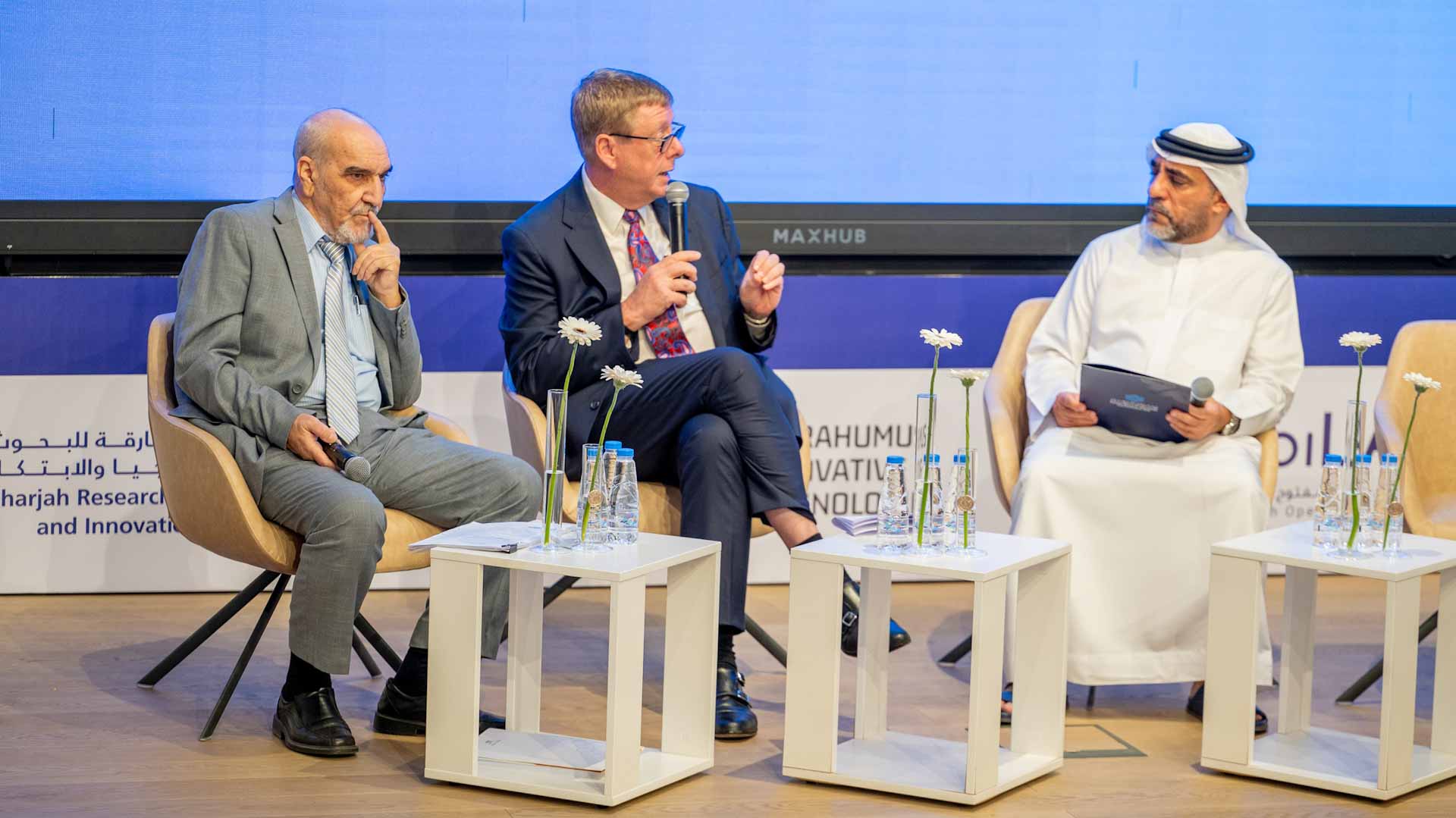 وكانت الجلسة الافتتاحية حول "دور المؤسسات التعليمية في نقل التكنولوجيا" بمشاركة الدكتور تود أ. لورسن، مدير الجامعة الأميركية في الشارقة والدكتور معمر بالطيب نائب مدير جامعة الشارقة لشؤون البحث العلمي، وقد أدار الجلسة حسين المحمودي، المدير التنفيذي لمجمع الشارقة للبحوث والتكنولوجيا والابتكار.