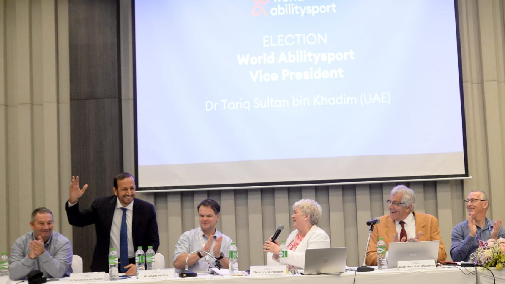 كما هنأ الدكتور عبد الرزاق أحمد بني رشيد رئيس اتحاد غرب آسيا، ممثل دولة الإمارات العربية المتحدة في أعمال الجمعية العمومية، بهذا الإنجاز الإداري الكبير مؤكداً أن ثقتنا كبيرة بفوز ابن الإمارات، وأن البرنامج الطموح الذي قدمه بن خادم للنهوض برياضة أصحاب الهمم، والدعم الكبير من القيادة الرشيدة والمؤسسات الحكومية والمسؤولين بالدولة، كان له دوراً كبيراً في تحقيق الإنجاز الذي أكد مكانة الإمارات على الخريطة العالمية.