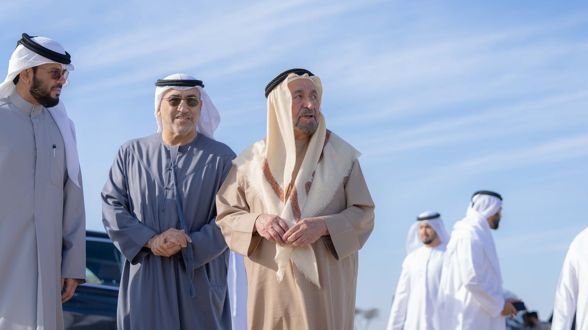 رافق سموه خلال زيارته، معالي عبد الرحمن بن محمد العويس وزير الصحة ووقاية المجتمع رئيس مجلس إدارة مصرف الشارقة الإسلامي، وسعادة الدكتور خليفة مصبح الطنيجي رئيس دائرة الزراعة والثروة الحيوانية.