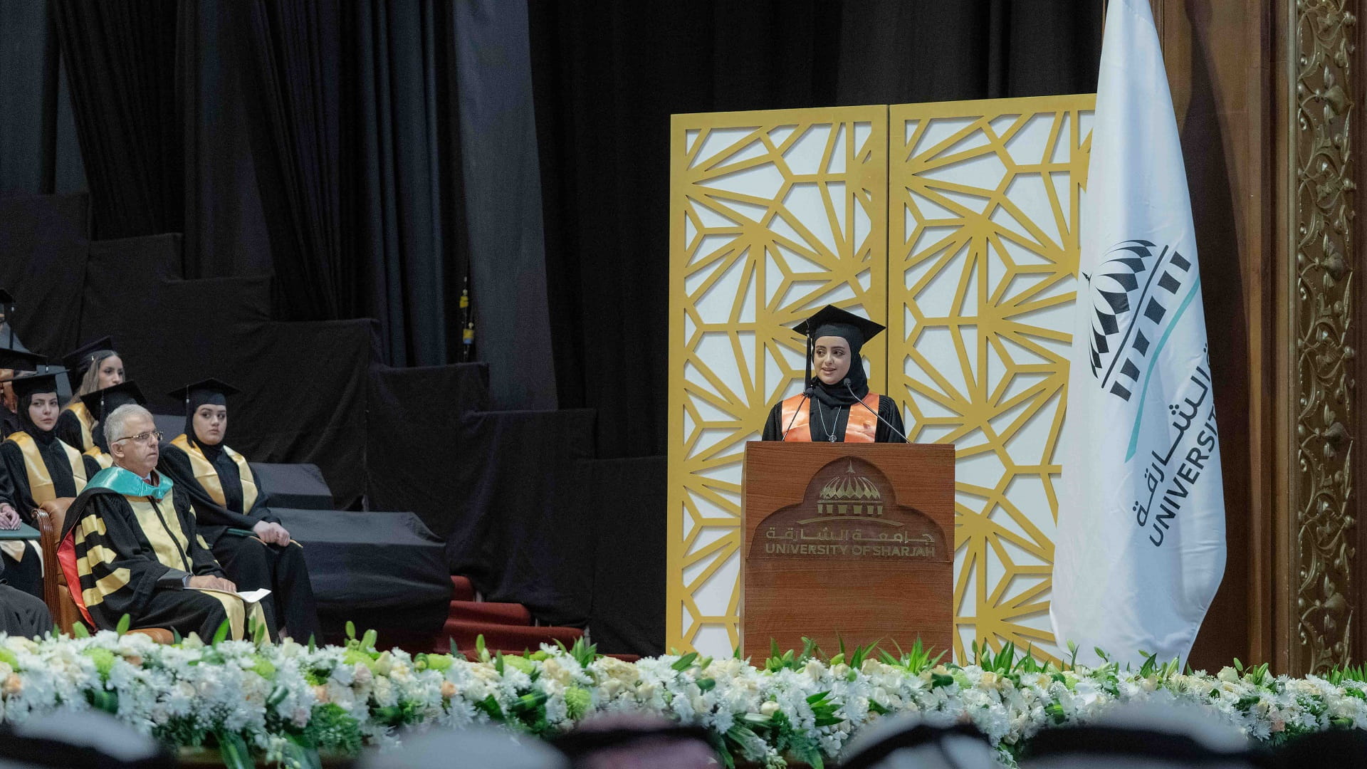 وألقت الخريجة موزة السويدي من كلية الهندسة كلمة بالنيابة عن زميلاتها الخريجات وجهت فيها الشكر والامتنان إلى صاحب السمو حاكم الشارقة ومؤسس جامعة الشارقة على دعم سموه اللامحدود للعلم وأهله، كما توجهت بالشكر والتقدير إلى سمو رئيس الجامعة، ولإدارتها وأعضاء هيئتيها التدريسية والإدارية الذين أحسنوا تأهيل وتدريب الطلبة لمواجهة متطلبات الحياة بكفاءة وقدرة.