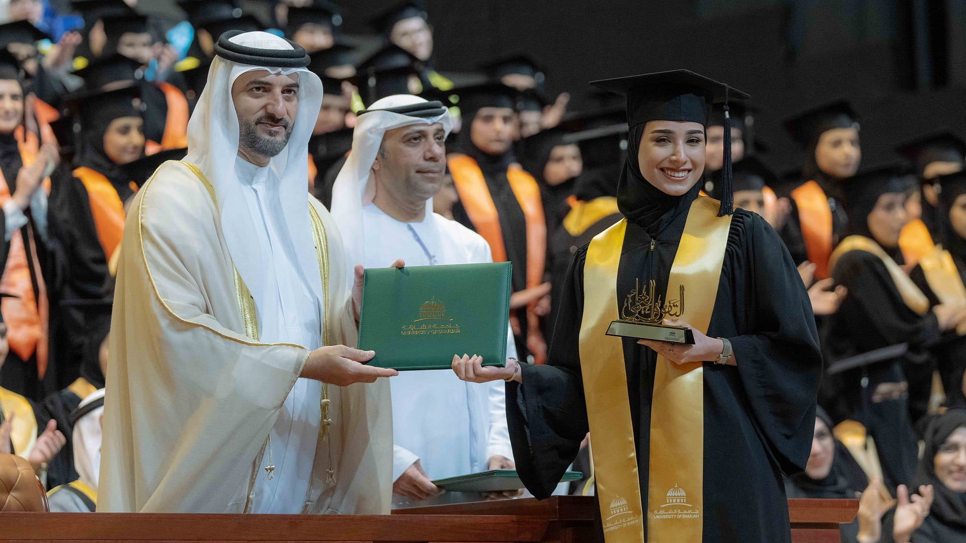 وقدم سمو رئيس جامعة الشارقة تهاني وتبريكات النجاح إلى آباء وأمهات وأولياء أمور الخريجات، مثمناً سموه دورهم الكبير في دعمهم، قائلاً: هذا اليوم هو يومكم ويوم فرحتكم وحصادكم، حيث يُتوج جهدكم وتعبكم واصراركم على دعم بناتكم وتخطيكم لكل الصعاب التي مررتم بها، مباركٌ لكم النجاح ومباركٌ لبناتكم وجودكم في حياتهن سنداً وعوناً لنجاحاتهم وتميزهم.