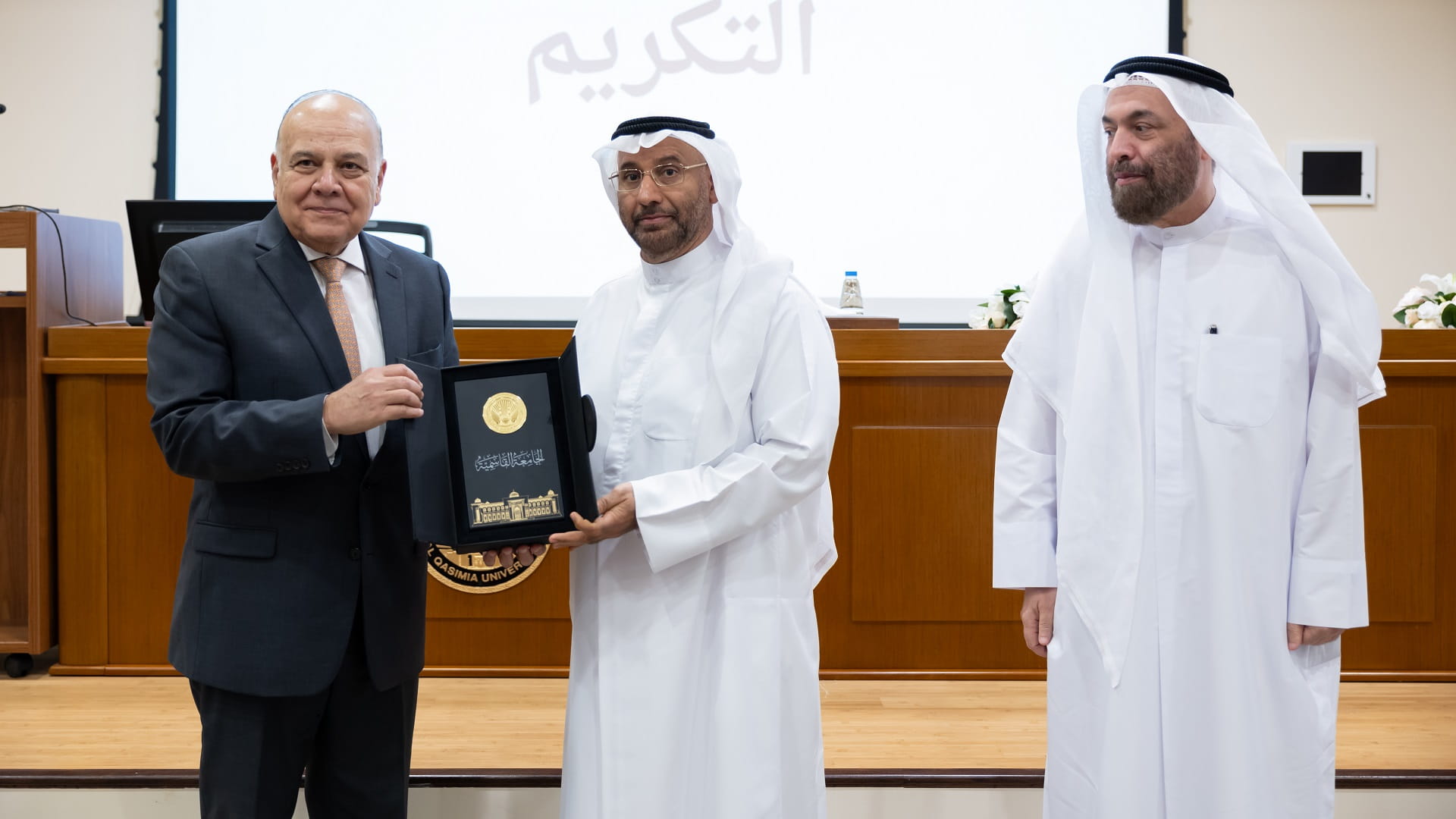 وفي نهاية المحاضرة، قدم الطريفي، درع الجامعة القاسمية، إلى الأستاذ الدكتور عمرو عزت سلامة، تقديراً لجهوده وإسهاماته العلمية البارزة.