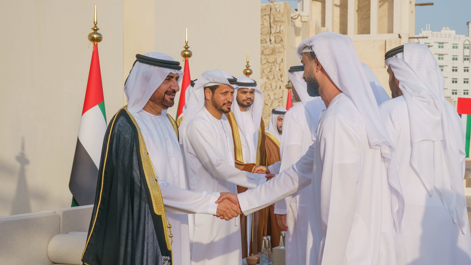 وصافح سمو نائب حاكم الشارقة لدى وصوله إلى موقع حفل الزفاف العرسان البالغ عددهم 16 عريساً، مباركاً لهم ولأسرهم هذه المناسبة السعيدة، وداعياً المولى عز وجل أن يؤلف بين قلوبهم ويرزقهم الحياة السعيدة العامرة بالمودة، والرحمة والذرية المباركة.
