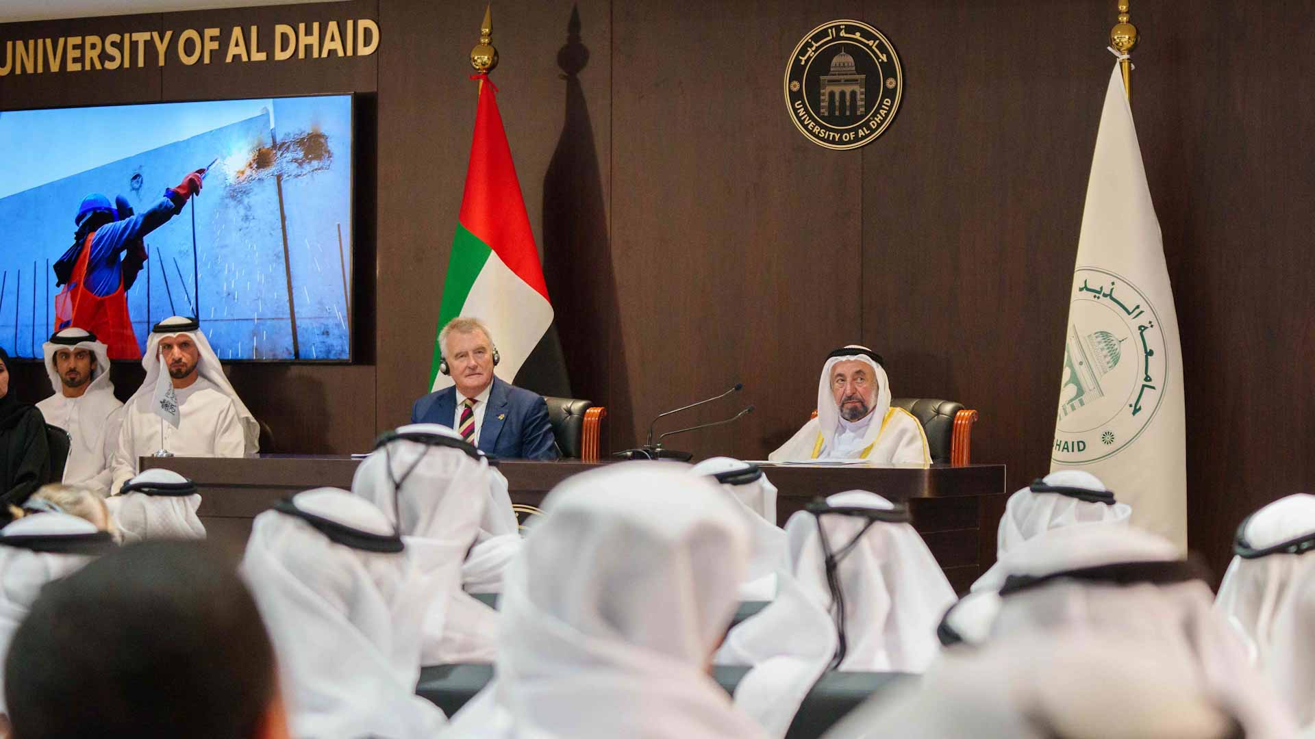 وكان صاحب السمو حاكم الشارقة والحضور قد شاهدوا عرضاً مرئياً عن مشروع جامعة الذيد ومراحل إنشاءها وبناء مرافق الجامعة وما تضمه من كليات ومرافق متنوعة.