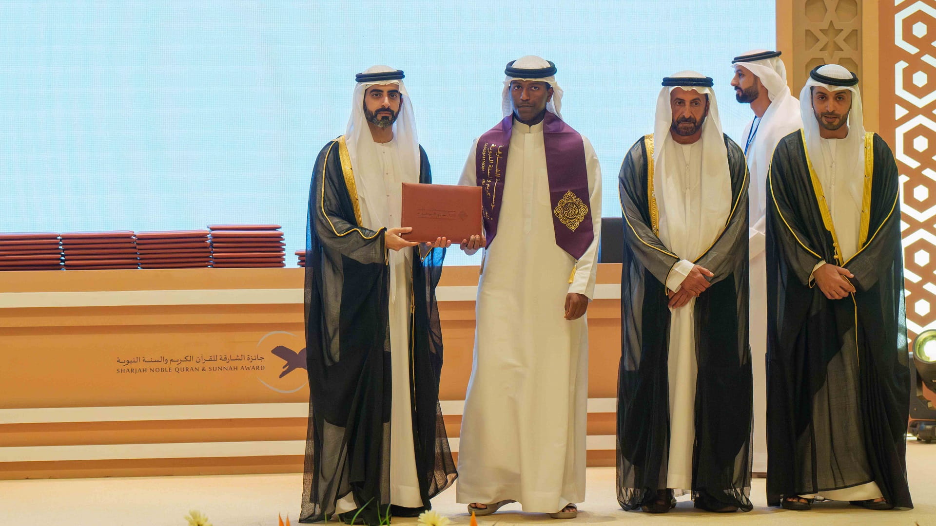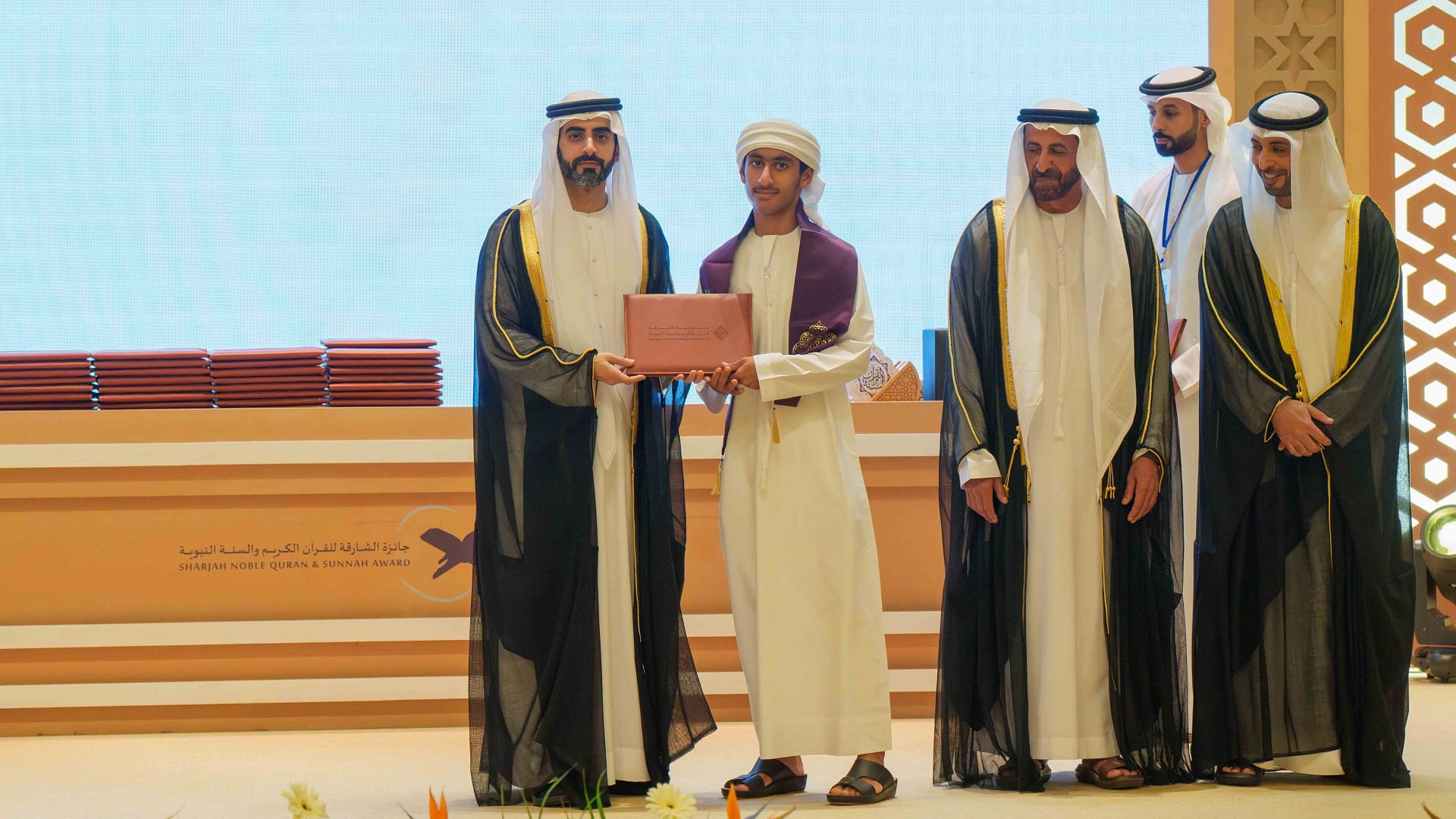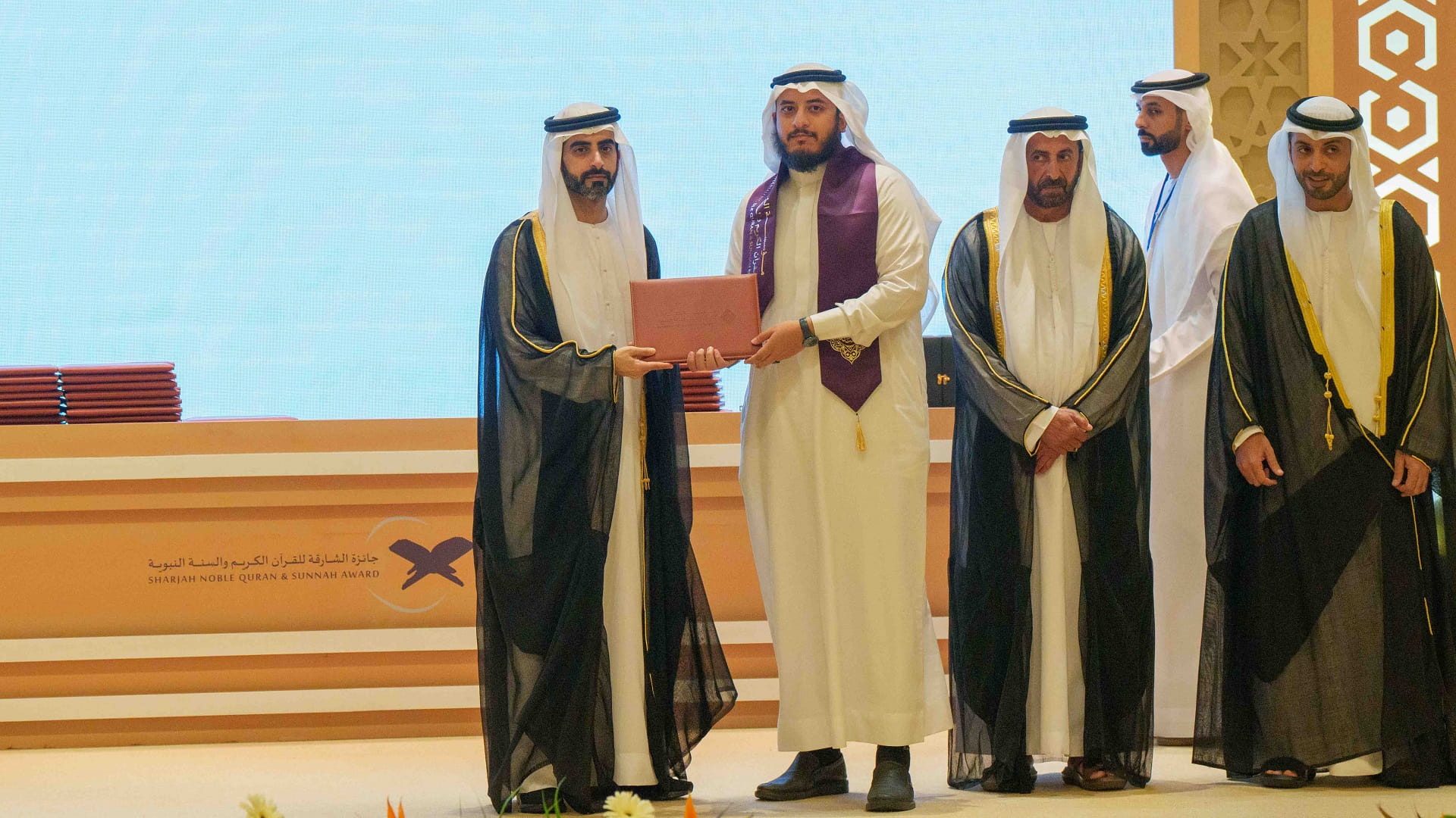 كما تسلم رئيس مكتب سمو الحاكم، درعاً تذكارياً، من مؤسسة الشارقة للقرآن الكريم والسنة تقديراً لتفضله بتشريف الحفل وتكريم الفائزين في هذه الدورة.