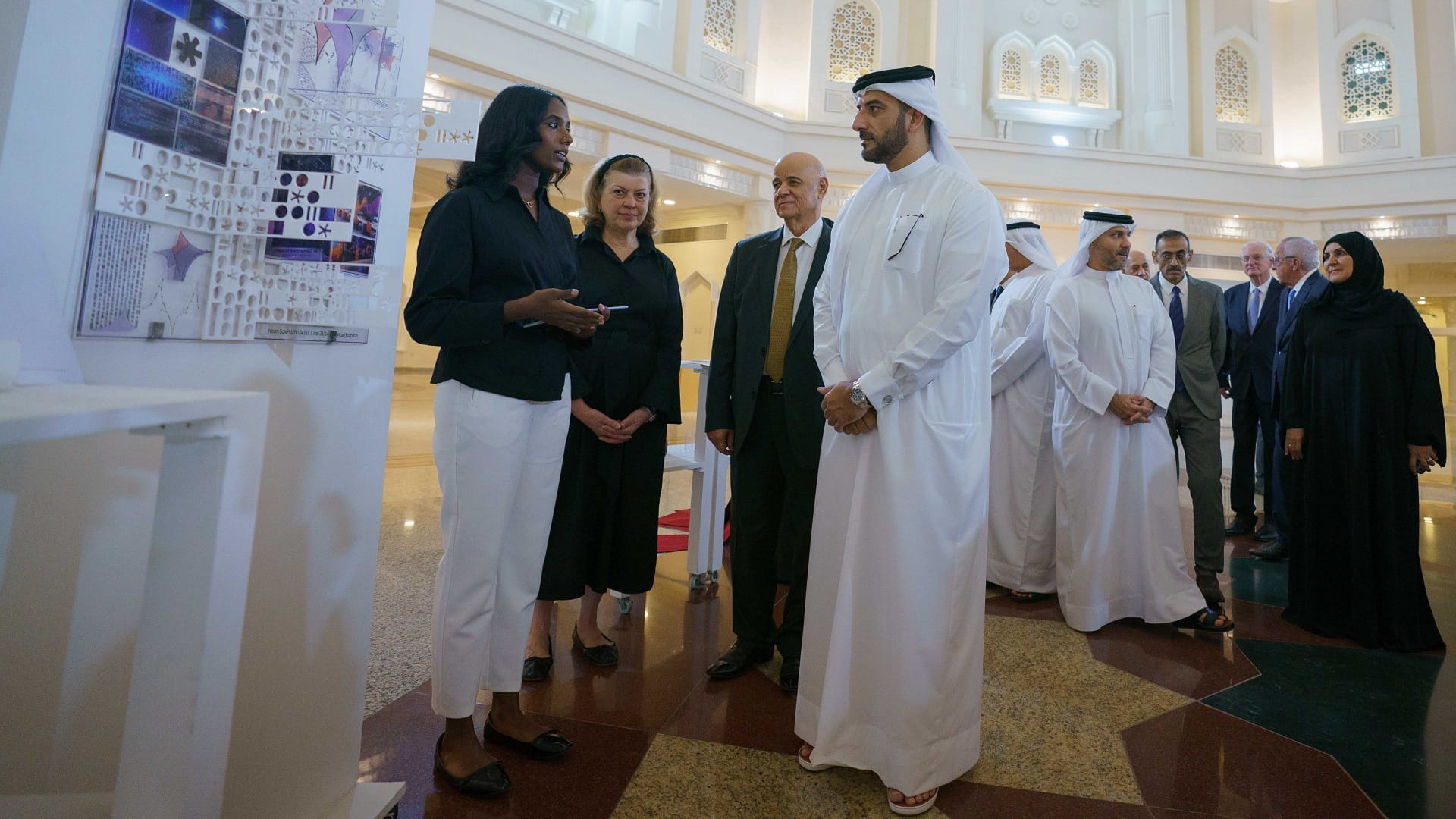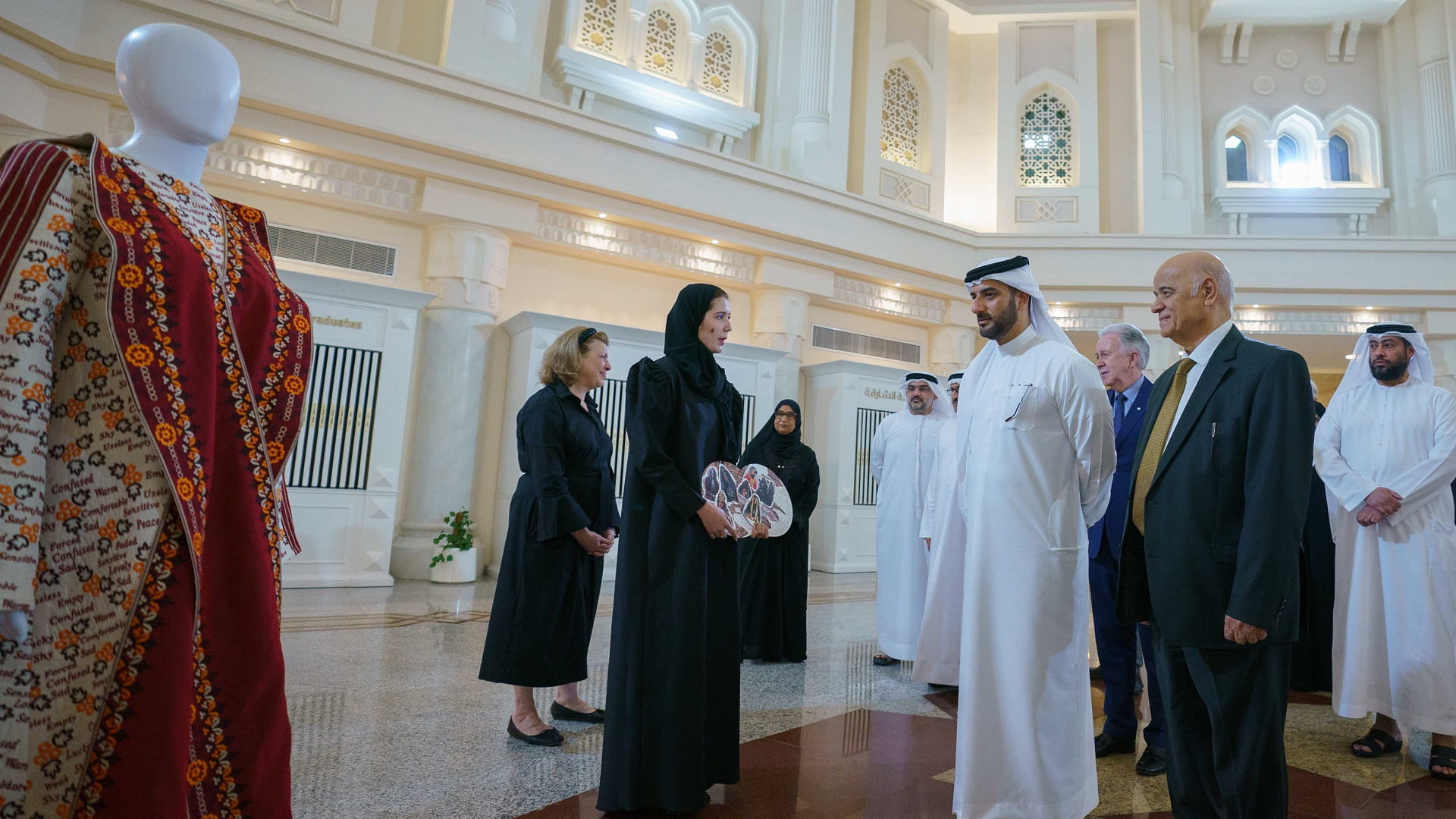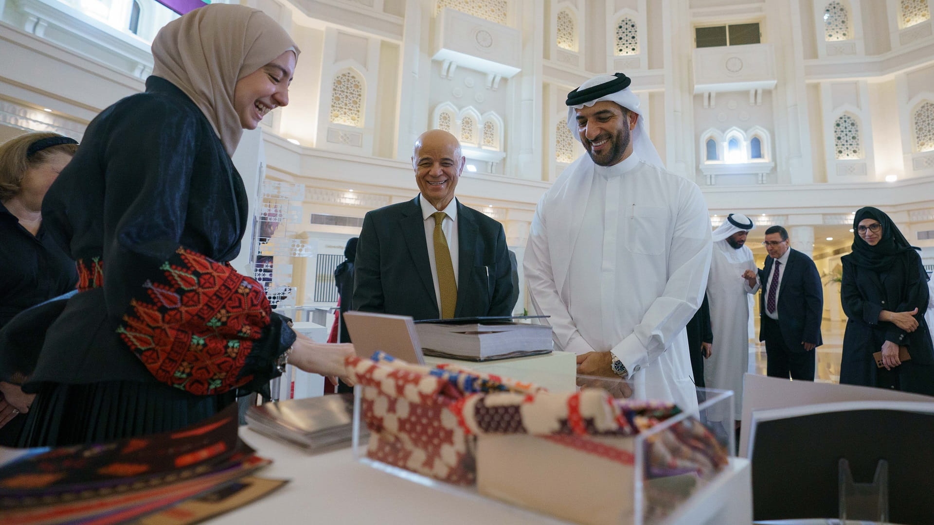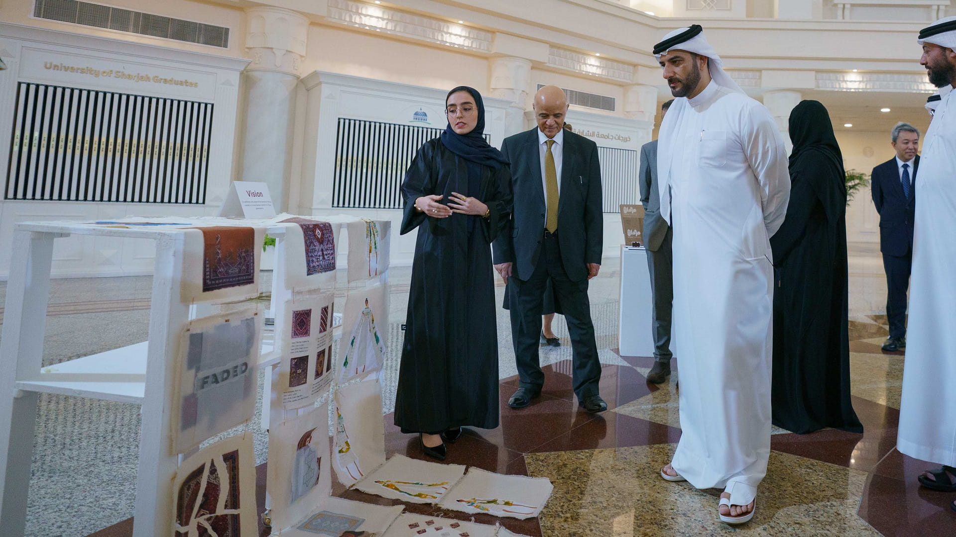 وتعرّف سمو رئيس جامعة الشارقة، على المواد المستخدمة في المشروعات وتنوعها من حيث اختلاف المنتج النهائي، إضافة إلى الأفكار المستوحاة للطلبة والتي تتنوع بين الحداثة والتقليد وإبراز الزخارف والتصاميم الرقمية والتركيز على تنوع الثقافات من خلال المشروعات المعروضة، حيث شارك طلبة الكلية من مختلف دول العالم مثل الإمارات وتركمانستان وفلسطين وإيران والسودان.