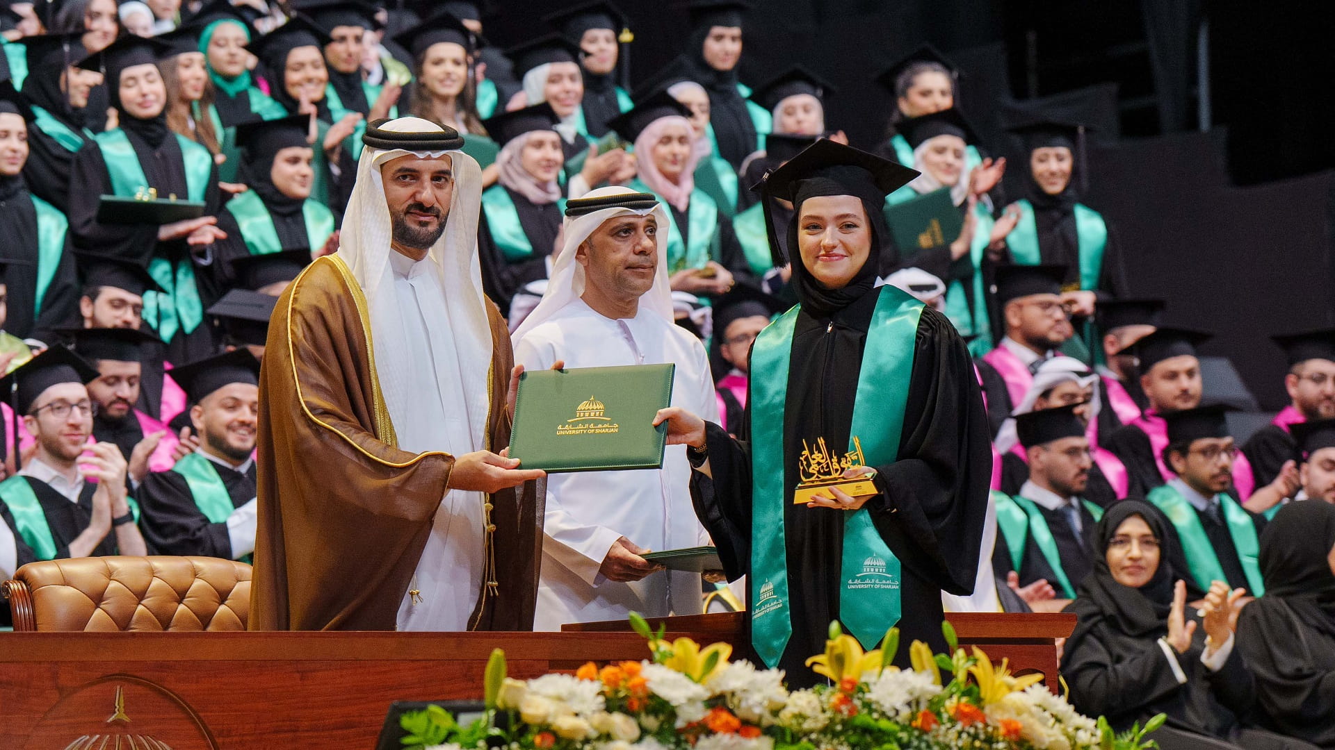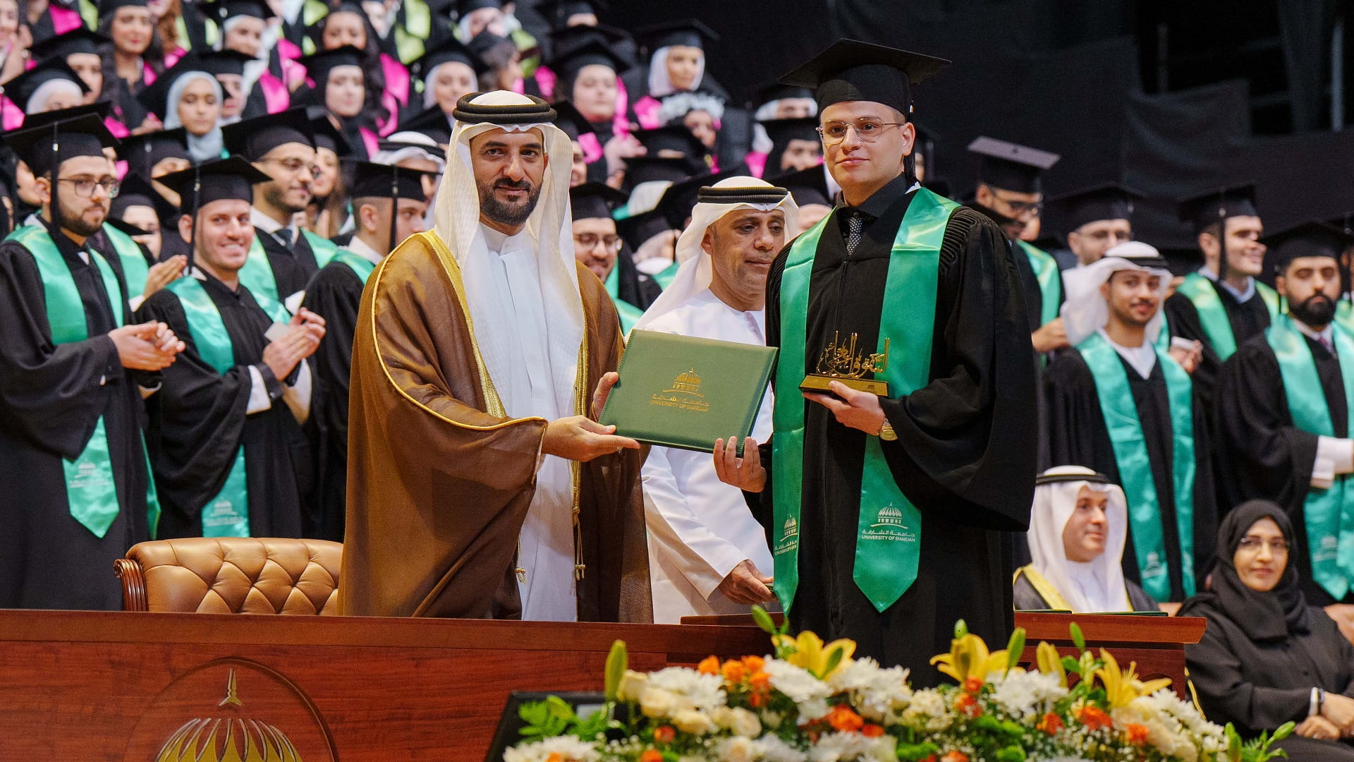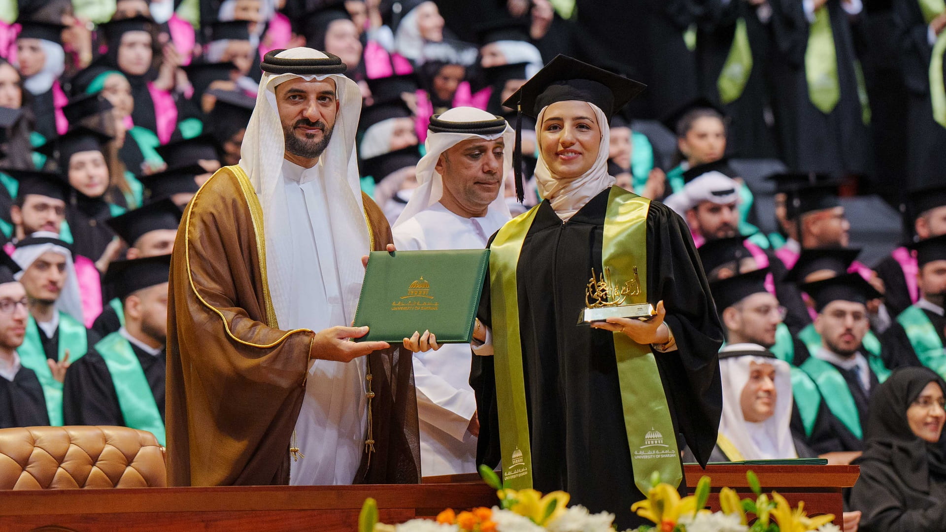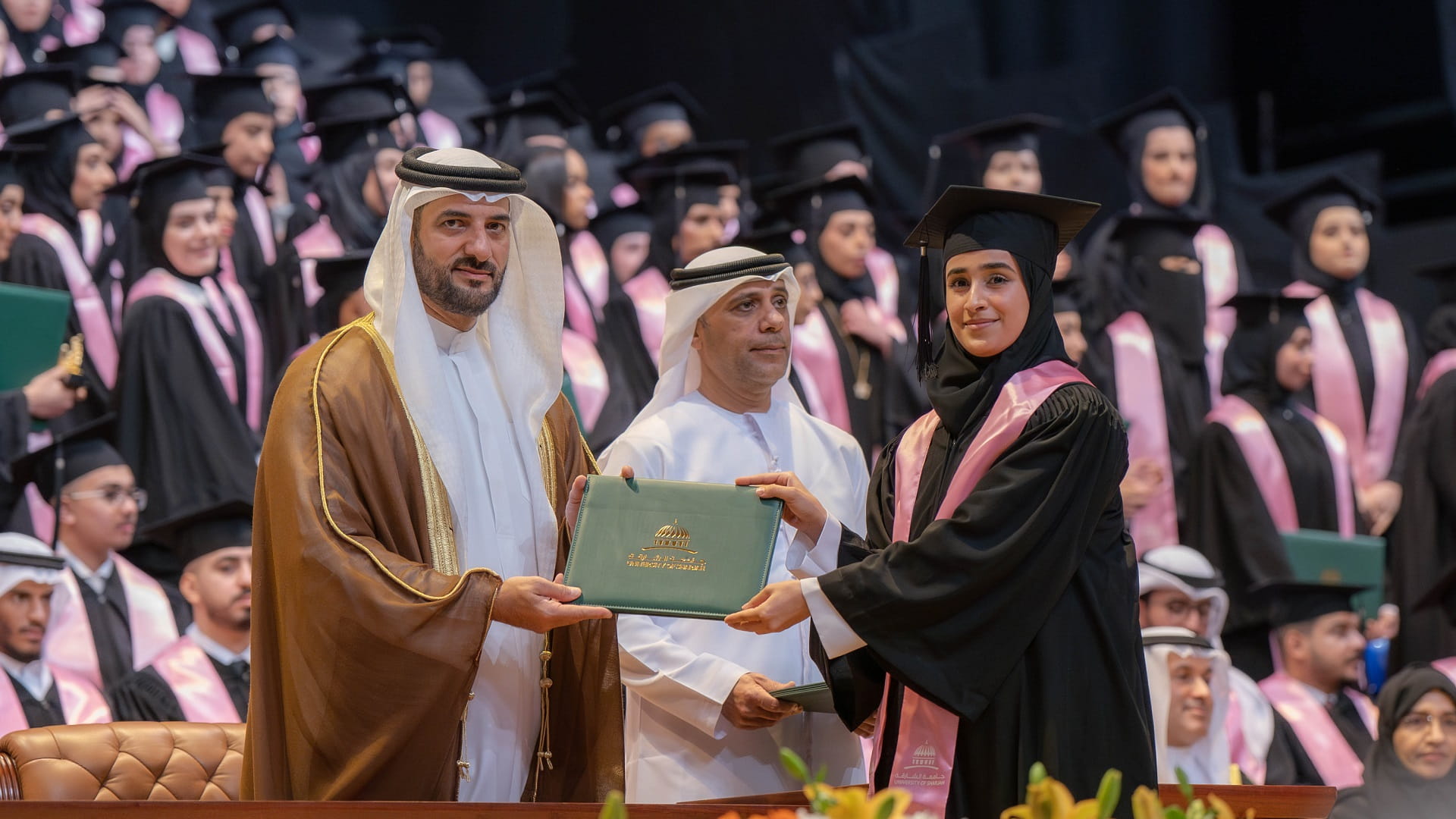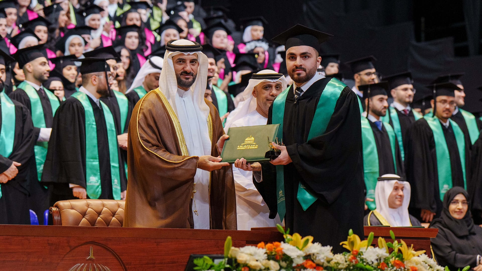 وتفضل سمو رئيس جامعة الشارقة، بتسليم الطلبة الخريجين والخريجات، شهادات تخرجهم مهنئاً إياهم هذا الإنجاز، وراجياً لهم التوفيق والسداد في حياتهم المستقبلية.