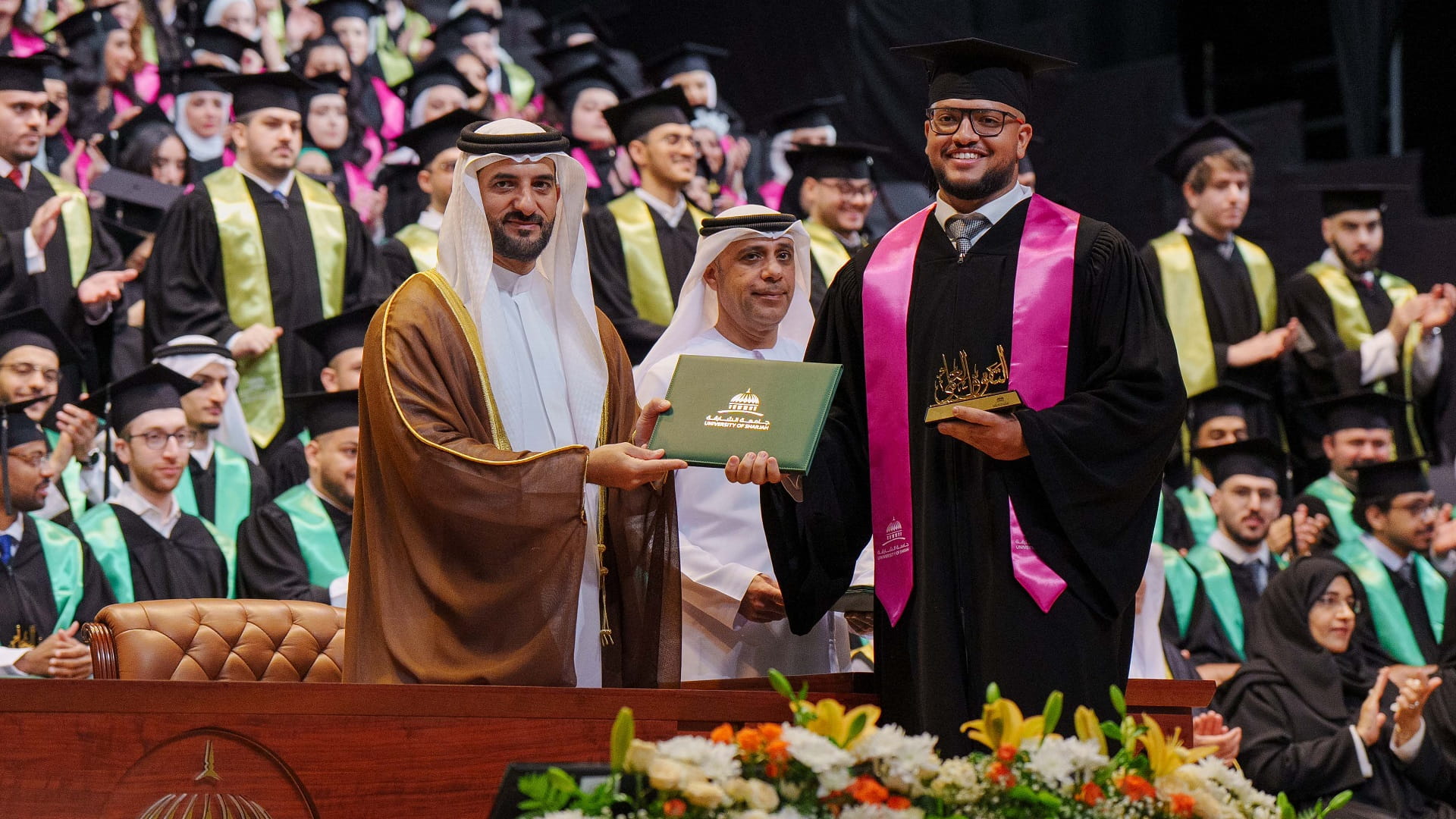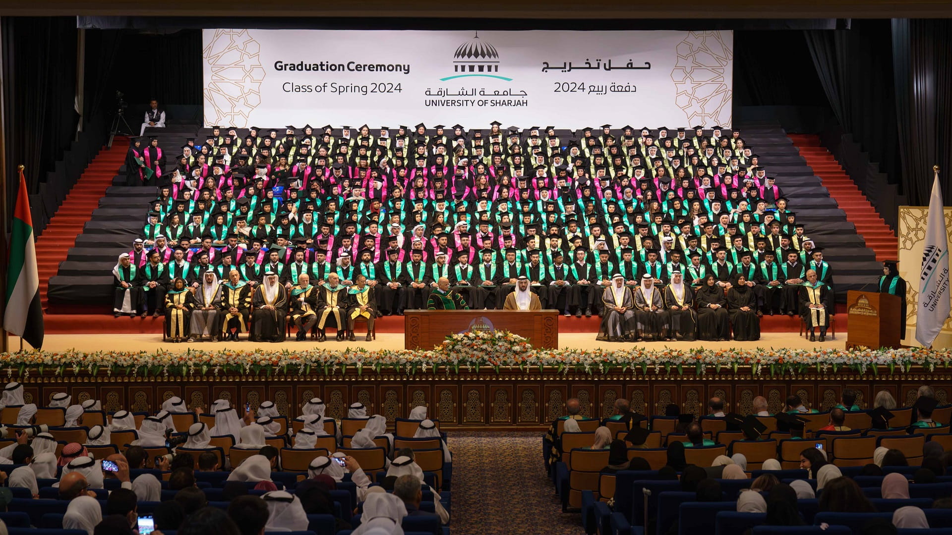 واختتم مدير جامعة الشارقة كلمته مخاطباً الخريجين والخريجات، مذكِراً إياهم كل من قدم لهم الدعم خلال مسيرتهم الدراسية ووصولهم إلى هذا الإنجاز، قائلاً: إننا نحتفل اليوم بإنجاز هو ثمرة جهود جليلة، كان للآباء والأمهات فيها الدور الكبير الذي يستحق الثناء، وإنني من خلالكم وباسمكم جميعاً أتوجه لأصحاب أيادي العطاء والبذل والتضحية، أولياء أموركم الأفاضل، على بذلهم وعطائهم من أجل أن تقفوا جميعاً في هذا المقام الخالد في ذاكرة كل واحد منكم، بكل الفخر والاعتزاز".