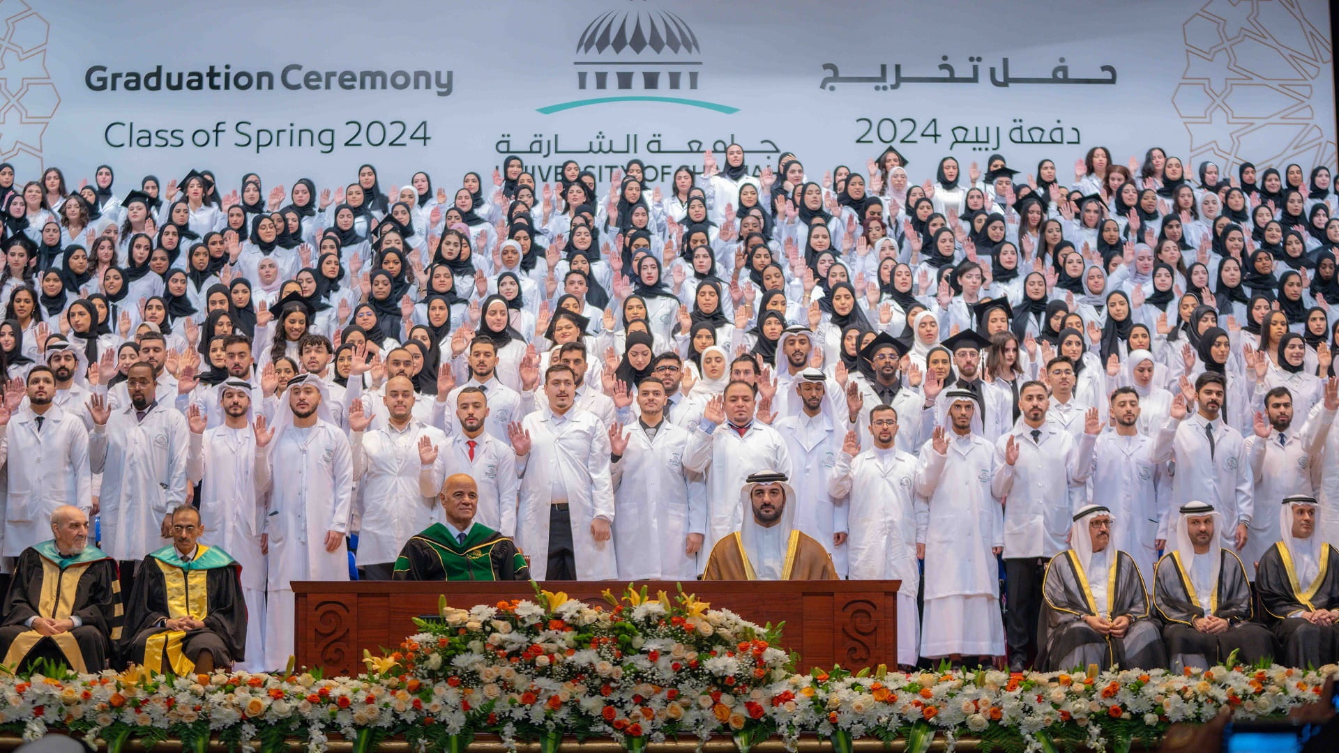 وفي نهاية حفل التخرج، أدى الخريجون والخريجات، قسم المهنيين في المجالات الطبية والصحية، أمام سمو الشيخ سلطان بن أحمد القاسمي نائب حاكم الشارقة رئيس جامعة الشارقة، متعهدين بأداء مهامهم الطبية والصحية بكل تفانٍ وإخلاصٍ.