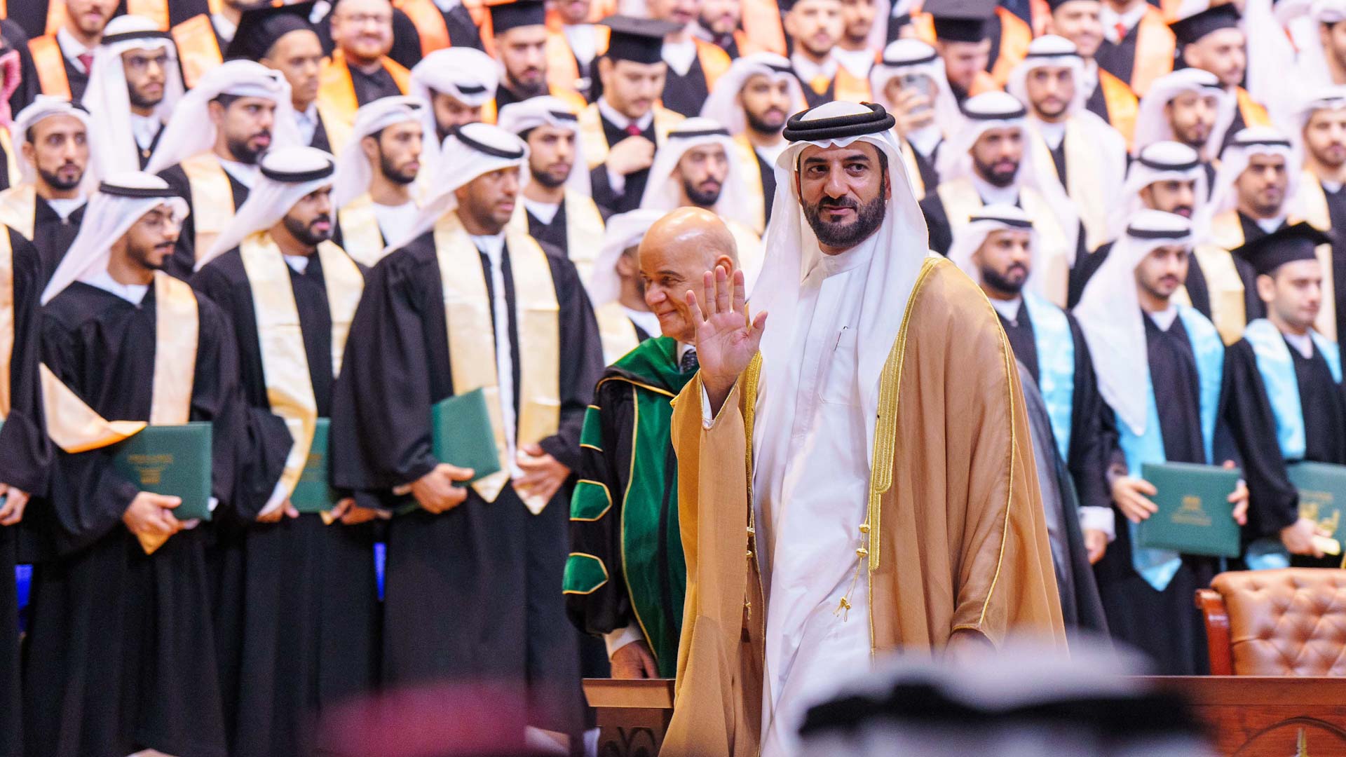 واختتم الخريج عبد الرحمن الحوسني كلمته بنصيحة زملائه قائلاً: "الآمال المعلقة علينا كبيرة، وطموحاتنا عالية، وهممنا كالجبال الراسية، فها نحن اليوم وقد تسلحنا بأجود أنواع العلوم، وأرقى درجات المعرفة، واكتسبنا كثيراً من المهارات والخبرات، حيث عول علينا الآن أن نكون جزءاً أساسياً في تحقيق رؤية الوطن الطموحة، هالله الله بالهمم العالية يا سفراء جامعة الشارقة، ولتكونوا – باسم إماراتكم الحبيبة شمساً للدنيا مشرقة، وأنواراً تملأ السماء بارقة، تستحضرون أنصع الصفحات، وتصنعون أروع المعجزات، وتحققون أحسن المنجزات، ليرتفع شأنكم، وترتقي بكم بلادكم، فالزمان لا يذكر من يقتني جواهر ثمينة، بقدر ما يتذكر من يحمل أفكاراً عظيمة، فاحملوا أمانتكم، وأطلقوا طاقتكم، وجددوا نشاطكم، حتى إذا ارتفعت قامتكم لامستم النجوم، فالعلم يهتف بالعمل، لنؤدي حق الوطن علينا، ونكمل مسيرة الخير والنماء الذي بناه آباؤنا وأجدادنا".