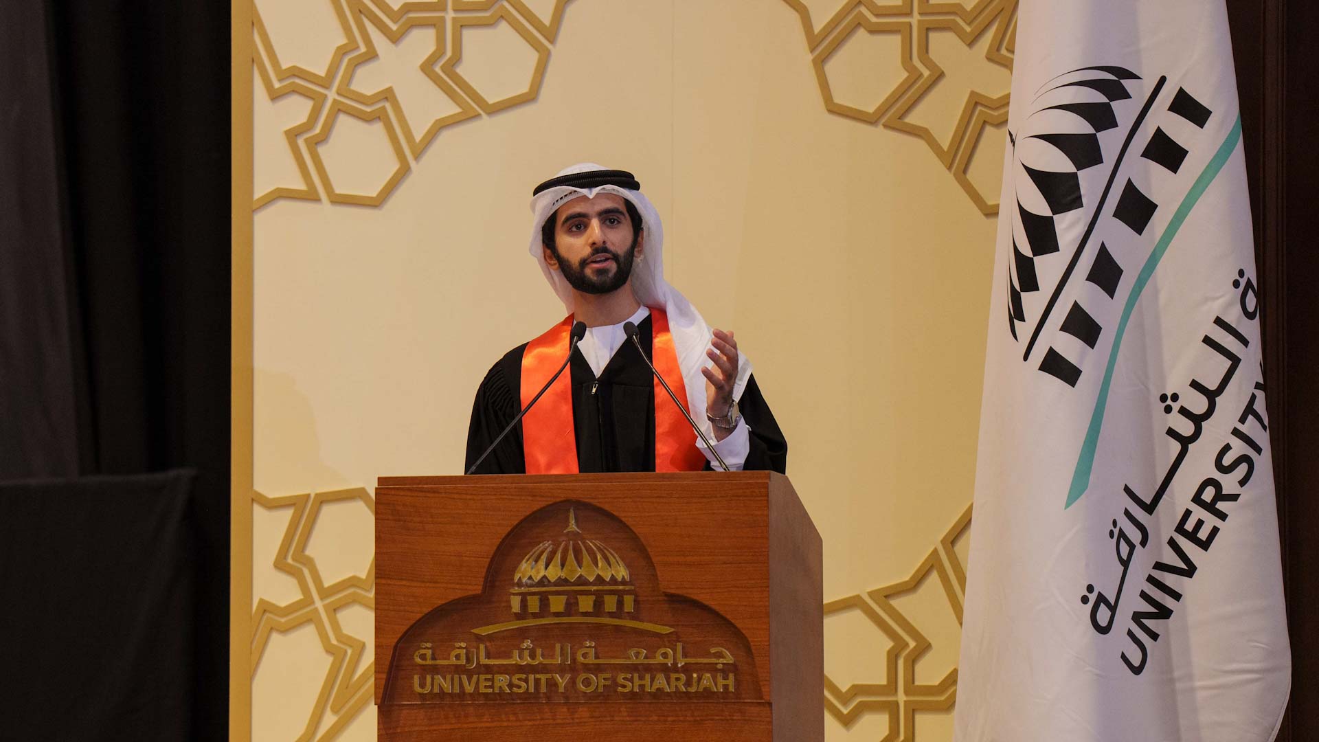واختتم مدير جامعة الشارقة كلمته قائلاً: "إن التخرج من الجامعة هو أهم ما يفتخر به الإنسان في مسيرته التعليمية، فحق لكل منكم الفخر والاعتزاز، وعليكم أن تشكروا الله تعالى أن تكللت جهودكم على مدى سنوات من التعب والمشقة والبذل والتضحية بهذا النجاح، فاجتمعتم اليوم على هذه المنصة الغالية، الخالدة في الذاكرة ما حييتم، وما كان لهذا الإنجاز أن يتحقق لولا البذل والتضحية من الآباء والأمهات الذين تتسابق دموعهم وقلوبهم فرحاً وابتهاجاً بهذا الإنجاز المشترك".