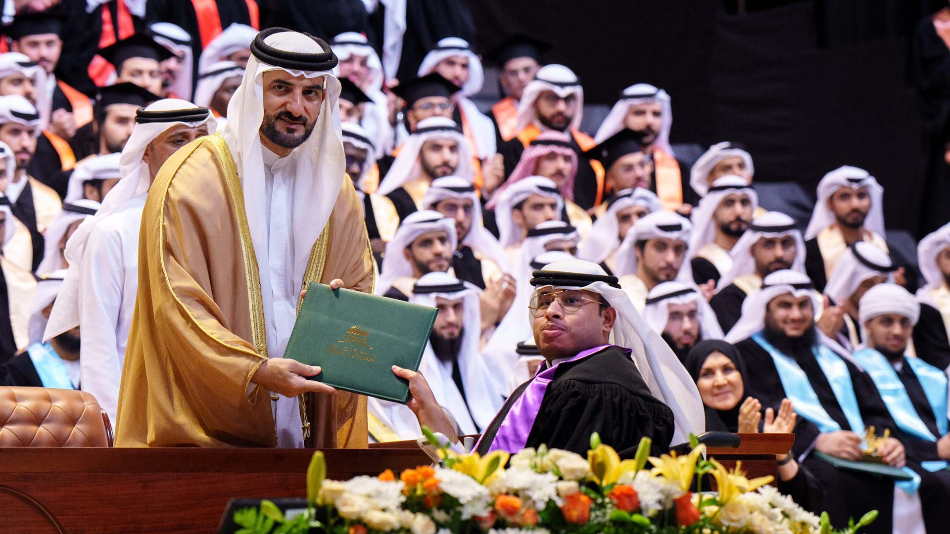 وتفضل سمو الشيخ سلطان بن أحمد القاسمي بتسليم الشهادات للطلاب الخريجين من كافة برامج البكالوريوس في كليات إدارة الأعمال، والاتصال، والآداب والعلوم الإنسانية والاجتماعية، والحوسبة والمعلوماتية، والسياسات العامة، والشريعة والدراسات الإسلامية، والعلوم، والفنون الجميلة والتصميم، والقانون، والهندسة مباركاً سموه للخريجين ومتمنياً لهم التوفيق في حياتهم القادمة.