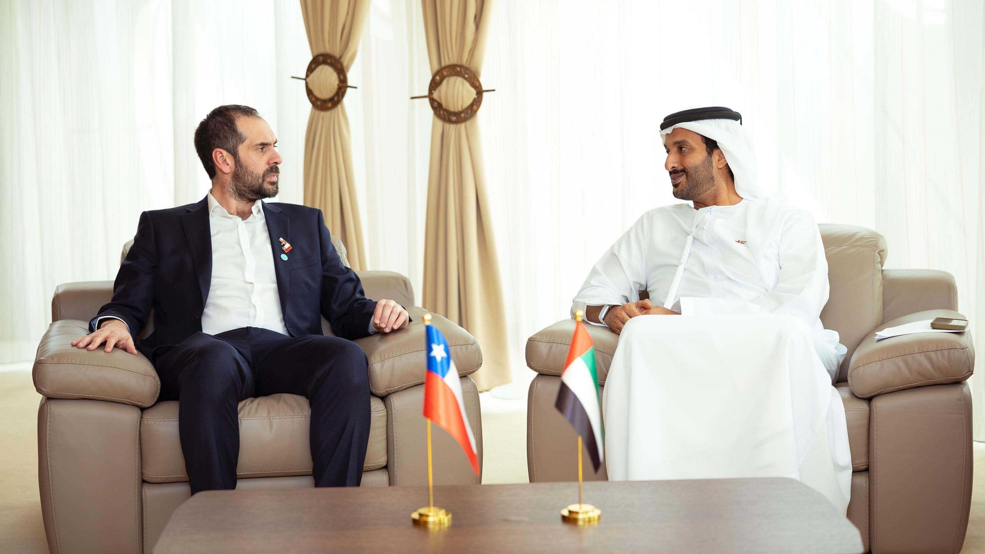 عقد معالي عبد الله بن طوق المري وزير الاقتصاد، اجتماعاً ثنائياً، مع نيكولاس غراو وزير الاقتصاد والتنمية والسياحة التشيلي، لبحث سُبل تنمية العلاقات الاقتصادية بين البلدين، في المجالات الاقتصادية الجديدة والسياحة والطيران وريادة الأعمال والتجارة الإلكترونية والطاقة المتجددة والتكنولوجيا والزراعة.