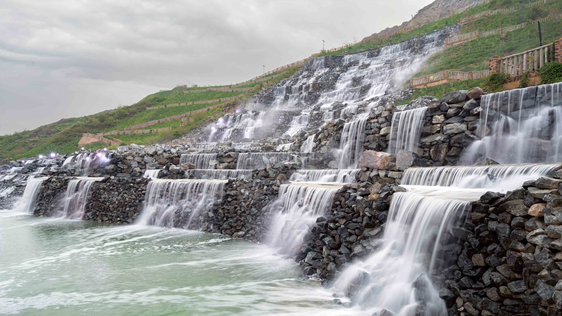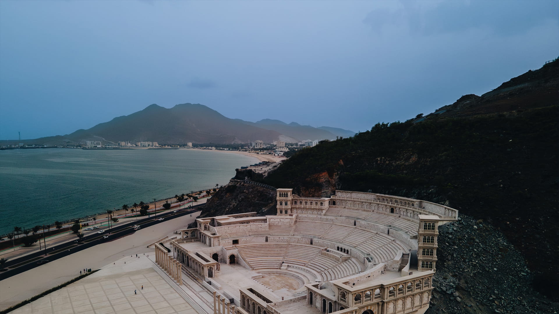 يمتاز التصميم المعماريّ لمدرَّج خورفكان بجَمعِه بين الطِّرازَين؛ الرُّومانِيّ، والإسلامِيّ، كما يتَّسِع لأكثر من 3,500 مُتفرِّج، ويُوفِّر إطلالاتٍ فريدة على شاطئ خورفكان مُباشَرةً، وهو يُعَدّ وُجهة مُميَّزة لحضور العديد من العروض والفعاليات المُنوَّعة، ولا يقتصر الأمر على ذلك فحسب؛ إذ صُمِّم شَلّال اصطِناعِيّ مُذهِل بالقُرب منه، وبلغ ارتفاعه 45 متراً، وعرضه 11 متراً.